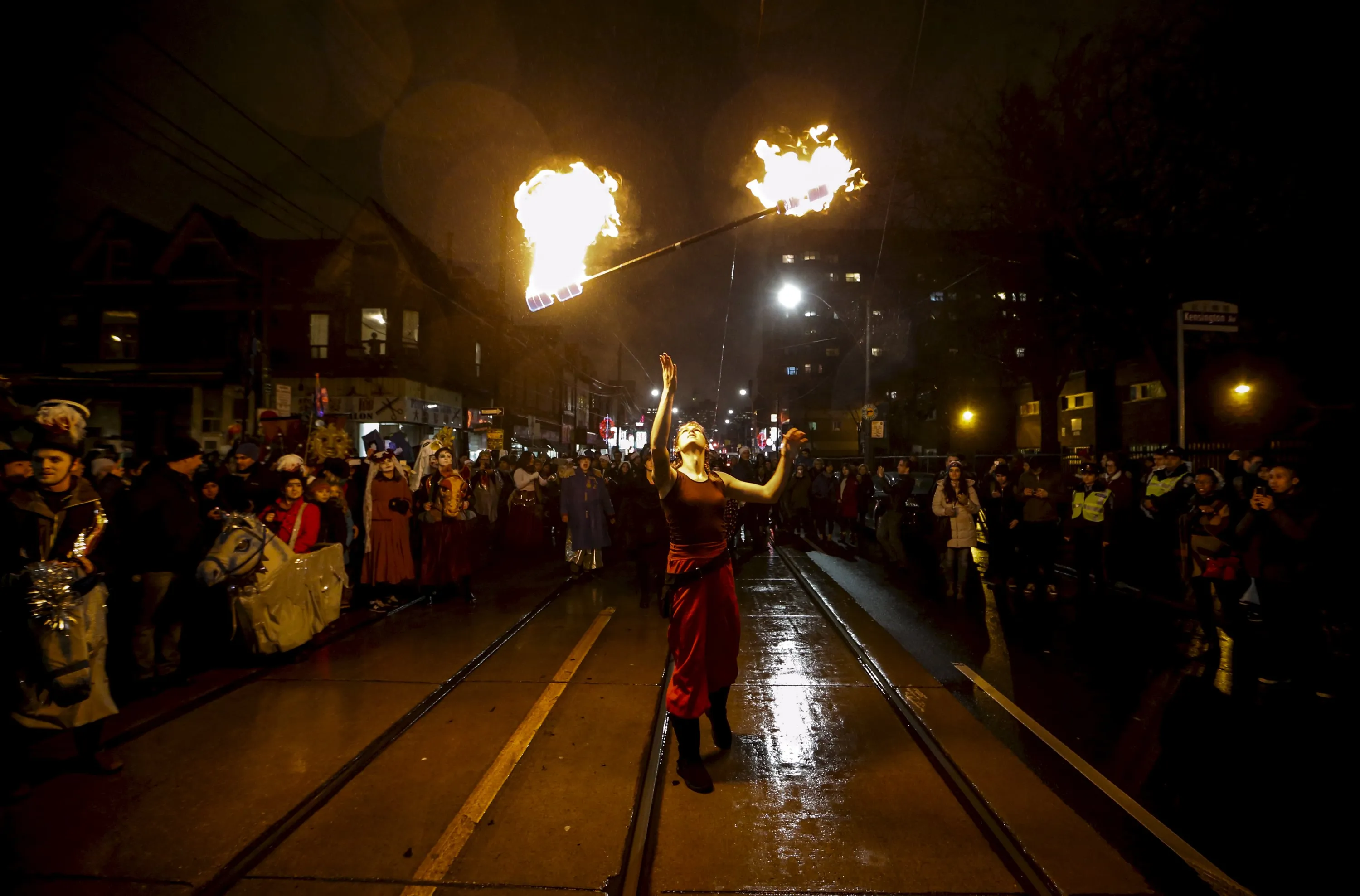 A performer throws a baton with fire on it in the air at the 26th Annual Kensington Market Winter Solstice Parade in Toronto, December 21, 2015. (Photo by Mark Blinch/Reuters)