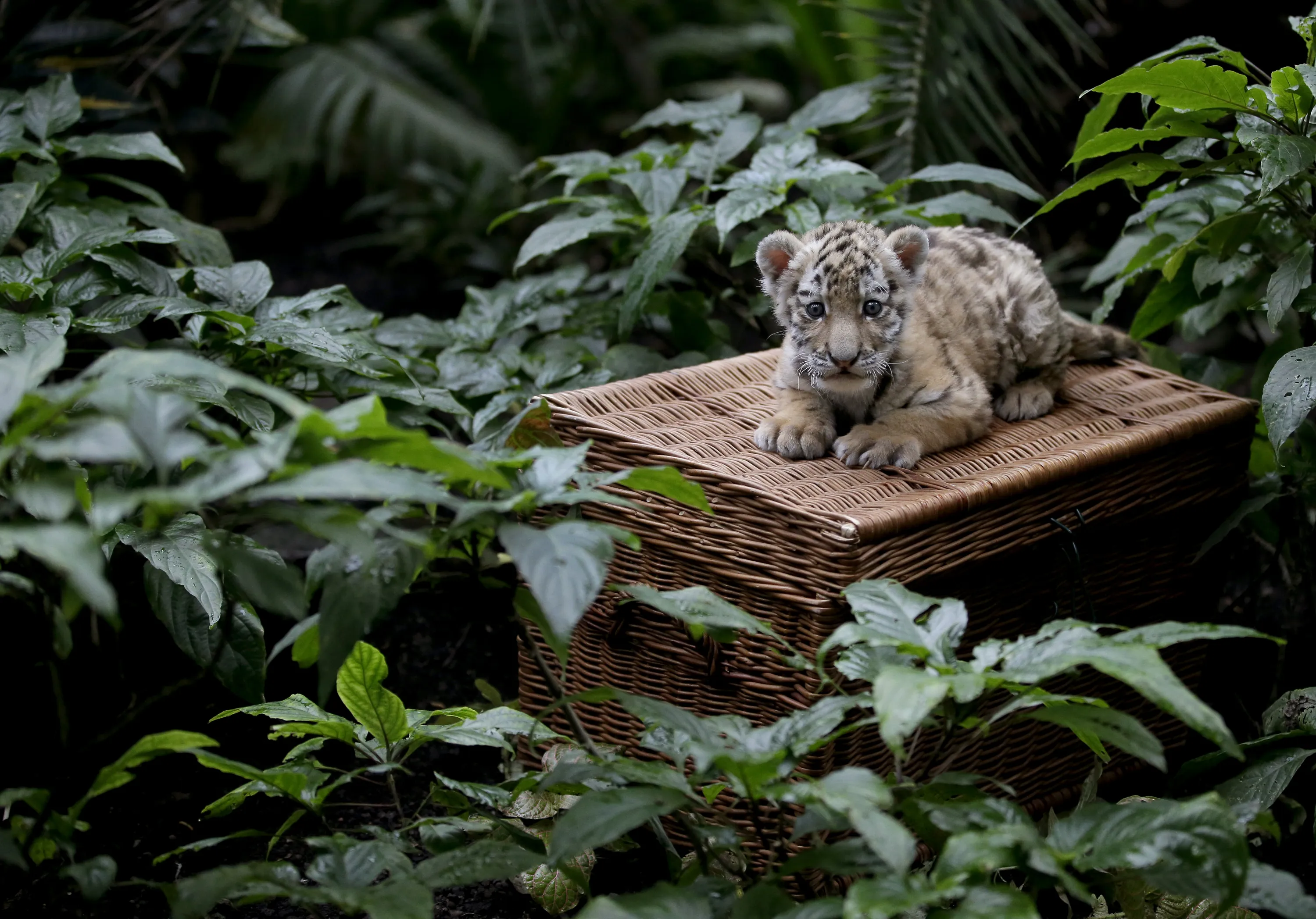 Little Amur tiger girl Alisha is presented to the public at the Tierpark zoo in Berlin, Germany, Thursday, January 22, 2015. Alisha is one of three young tigers born in December 2014. Two died because their mother Aurora could not produce enough milk for them, so the zoo decided to feed the cub by hand. (Photo by Michael Sohn/AP Photo)