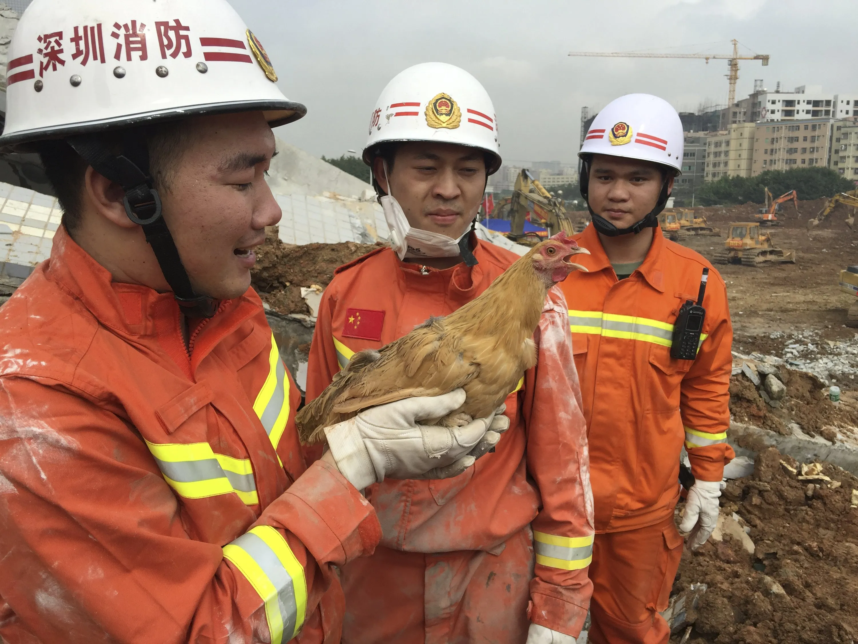 Firefighters look at a hen which was rescued from the debris of a collapsed building after a landslide hit an industrial park on Sunday, in Shenzhen, Guangdong province, China, December 23, 2015. (Photo by Reuters/Stringer)