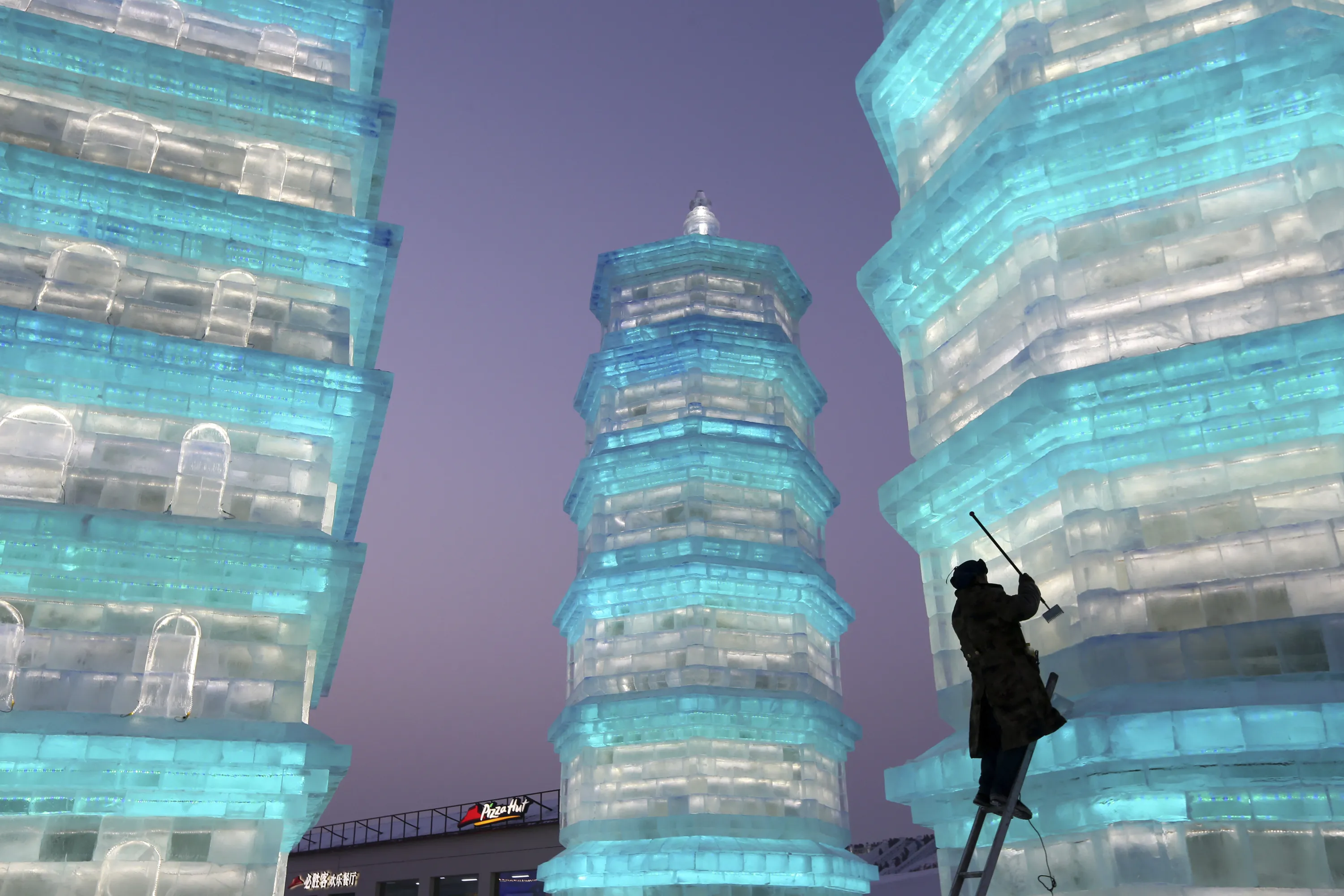 In this Tuesday, December 22, 2015 photo, a man works on an ice sculpture at the Ice and Snow World during a soft opening of the exhibit in Harbin in northeastern China's Heilongjiang province. The annual collection of snow and lighted ice sculptures is a major tourist draw to the city during the winter months. (Photo by Chinatopix via AP Photo)