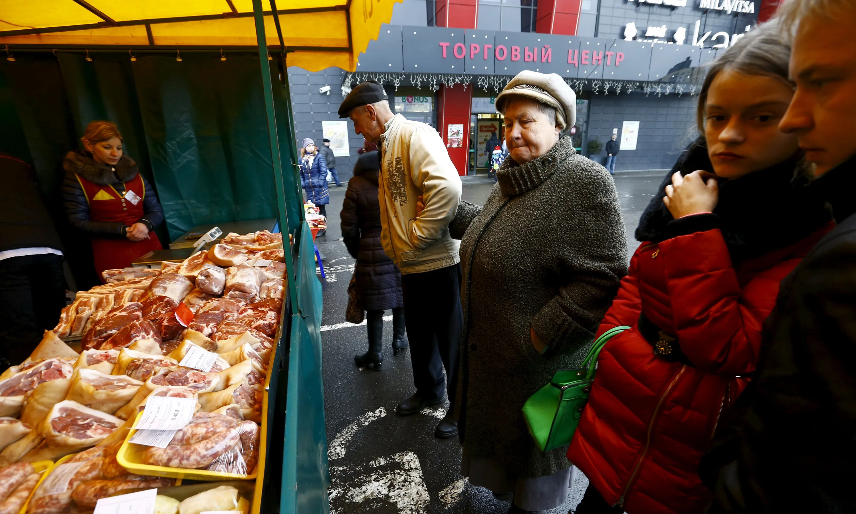 People look at pork at a street market during a food fair in Minsk, Belarus December 19, 2015. (Photo by Vasily Fedosenko/Reuters)