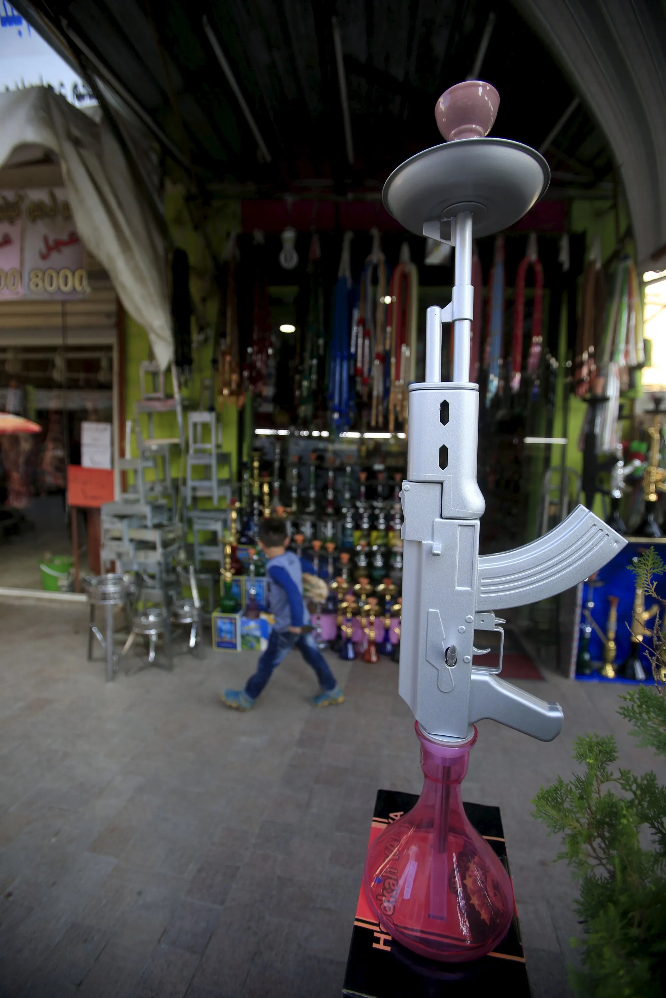 A hookah shaped like a rifle is displayed for sale in a souk at the port city of Sidon, southern Lebanon, December 23, 2015. (Photo by Ali Hashisho/Reuters)