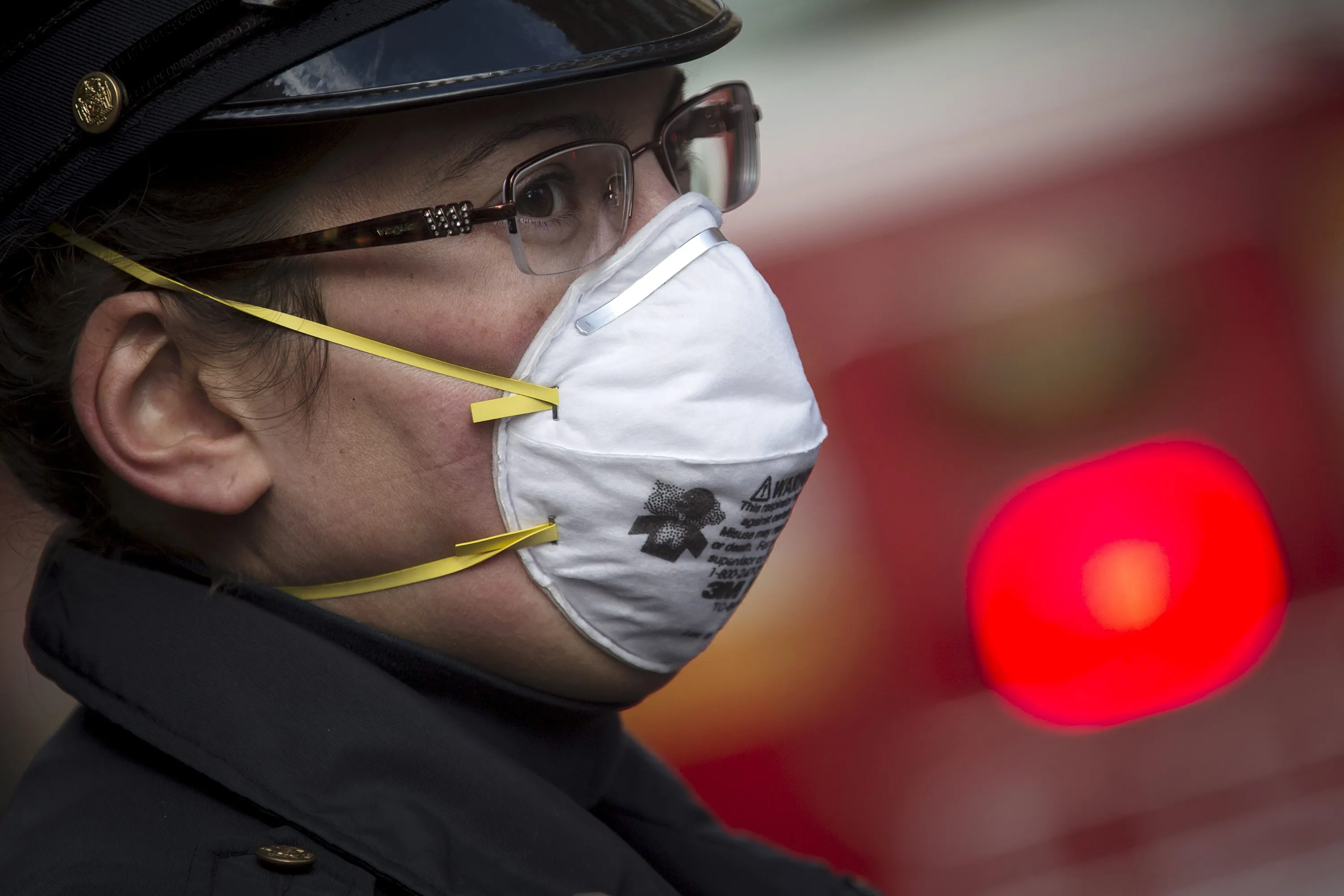 A police officer wears a mask at the scene of a fire which consumed a building that was under construction in the Manhattan borough of New York October 20, 2015. (Photo by Carlo Allegri/Reuters)