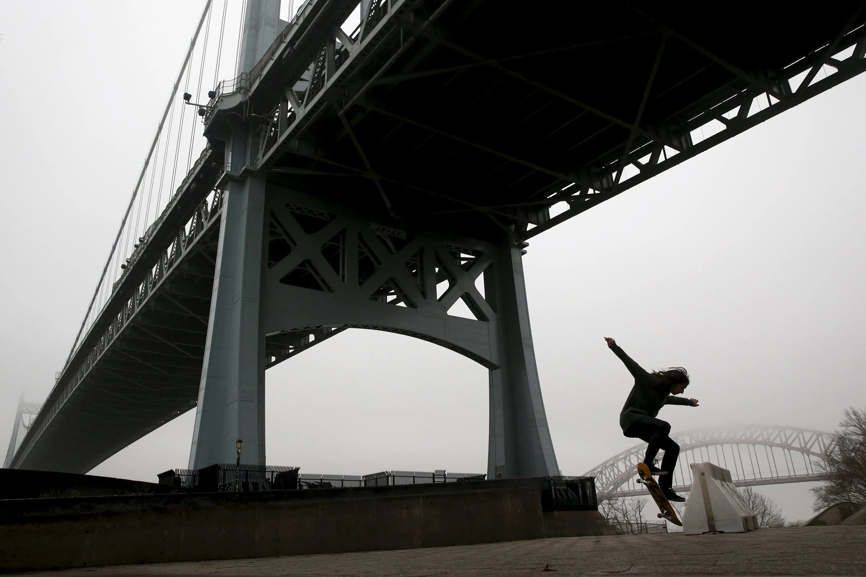 A skateboarder is seen in silhouette under a fog covered Triborough Bridge in the Queens borough of New York, December 23, 2015. (Photo by Shannon Stapleton/Reuters)
