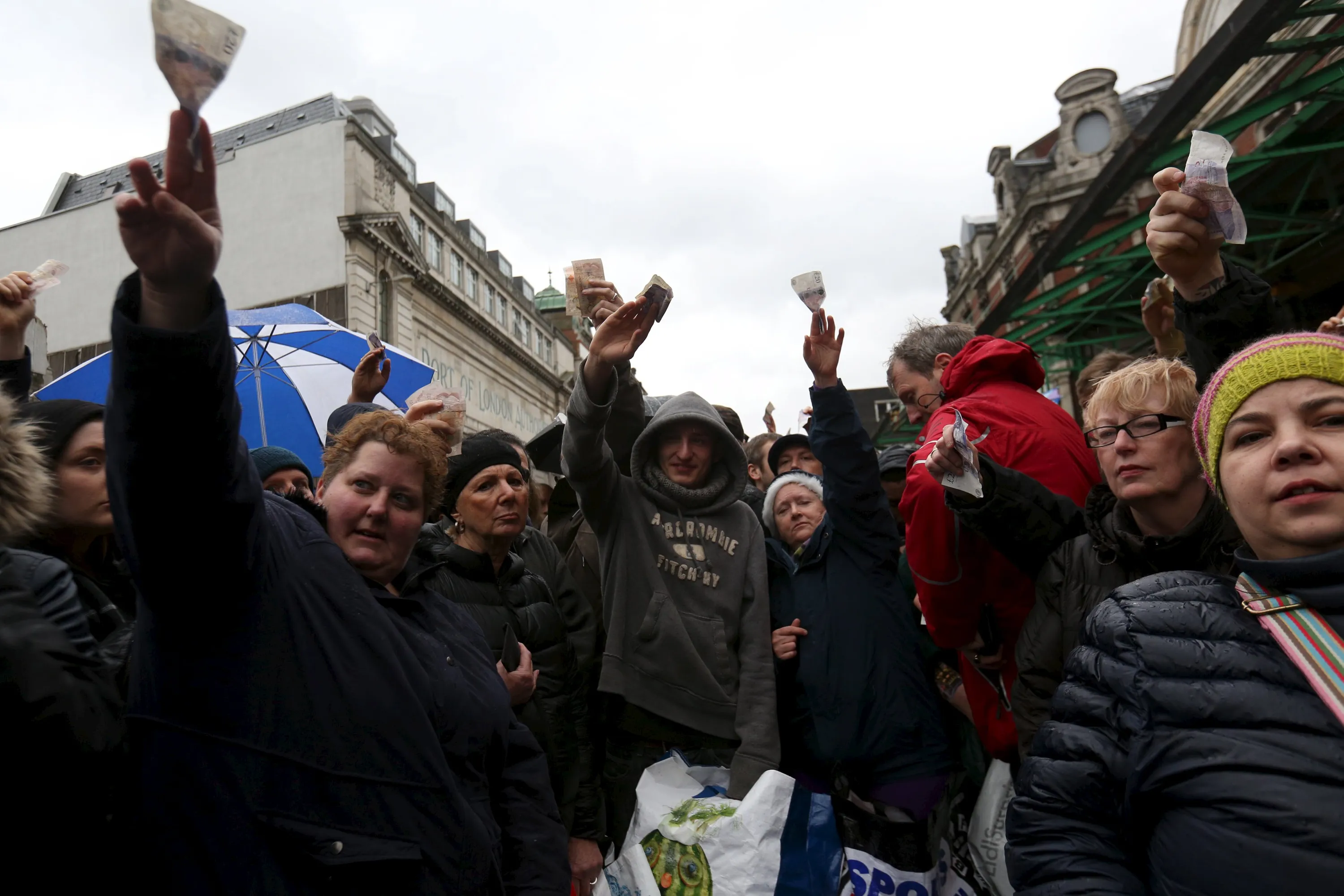 People react as butchers sell their remaining produce of the year at discounted prices during the traditional Christmas Eve auction at Smithfield's market in London December 24, 2015. (Photo by Neil Hall/Reuters)