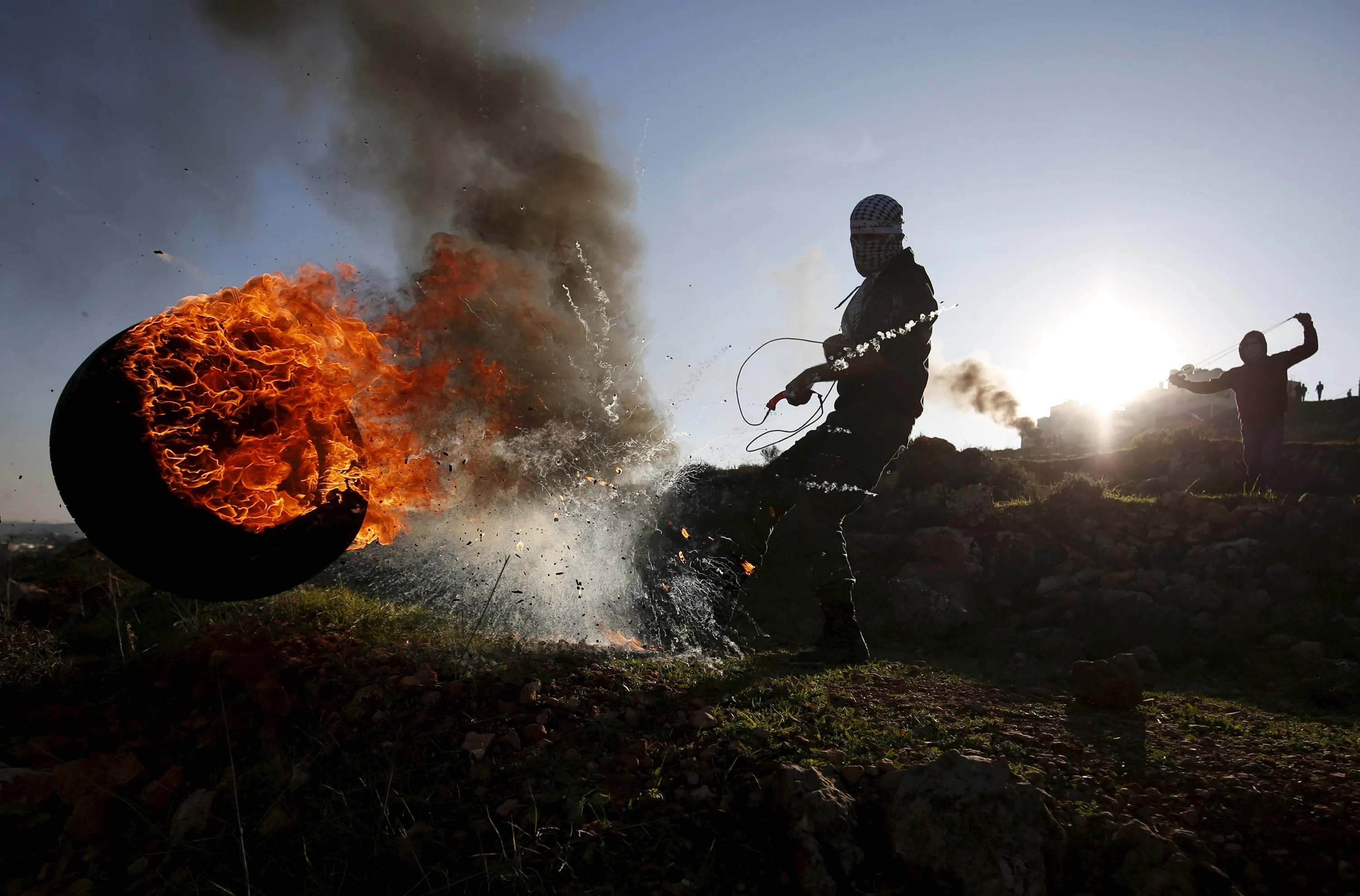 A Palestinian protester kicks a burning tyre during clashes with Israeli troops, near Israel's Ofer Prison near the West Bank city of Ramallah December 25, 2015. (Photo by Mohamad Torokman/Reuters)