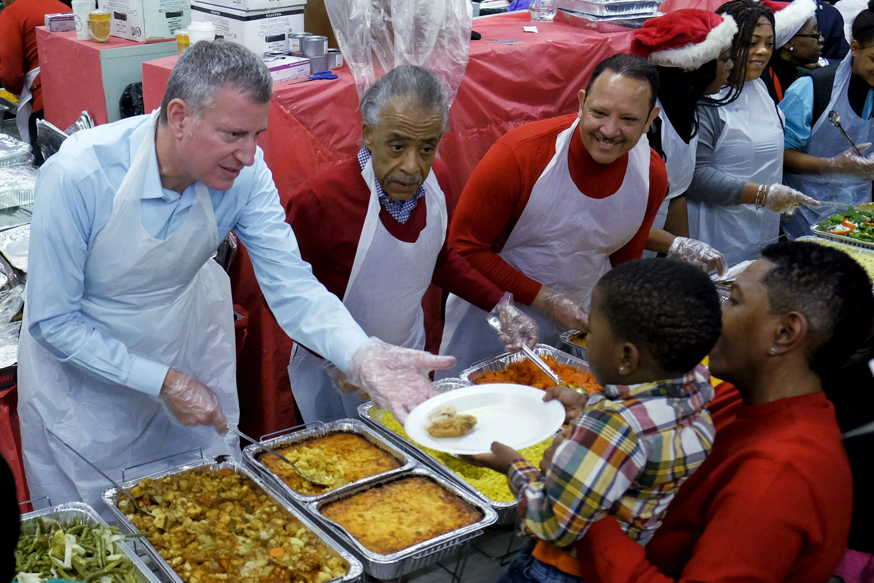 New York City Mayor Bill de Blasio (L) and civil rights activist Al Sharpton (2nd L) serve food to children and people while they take part in a event celebrating Christmas at the National Action Network in Harlem, New York December 25, 2015. (Photo by Eduardo Munoz/Reuters)
