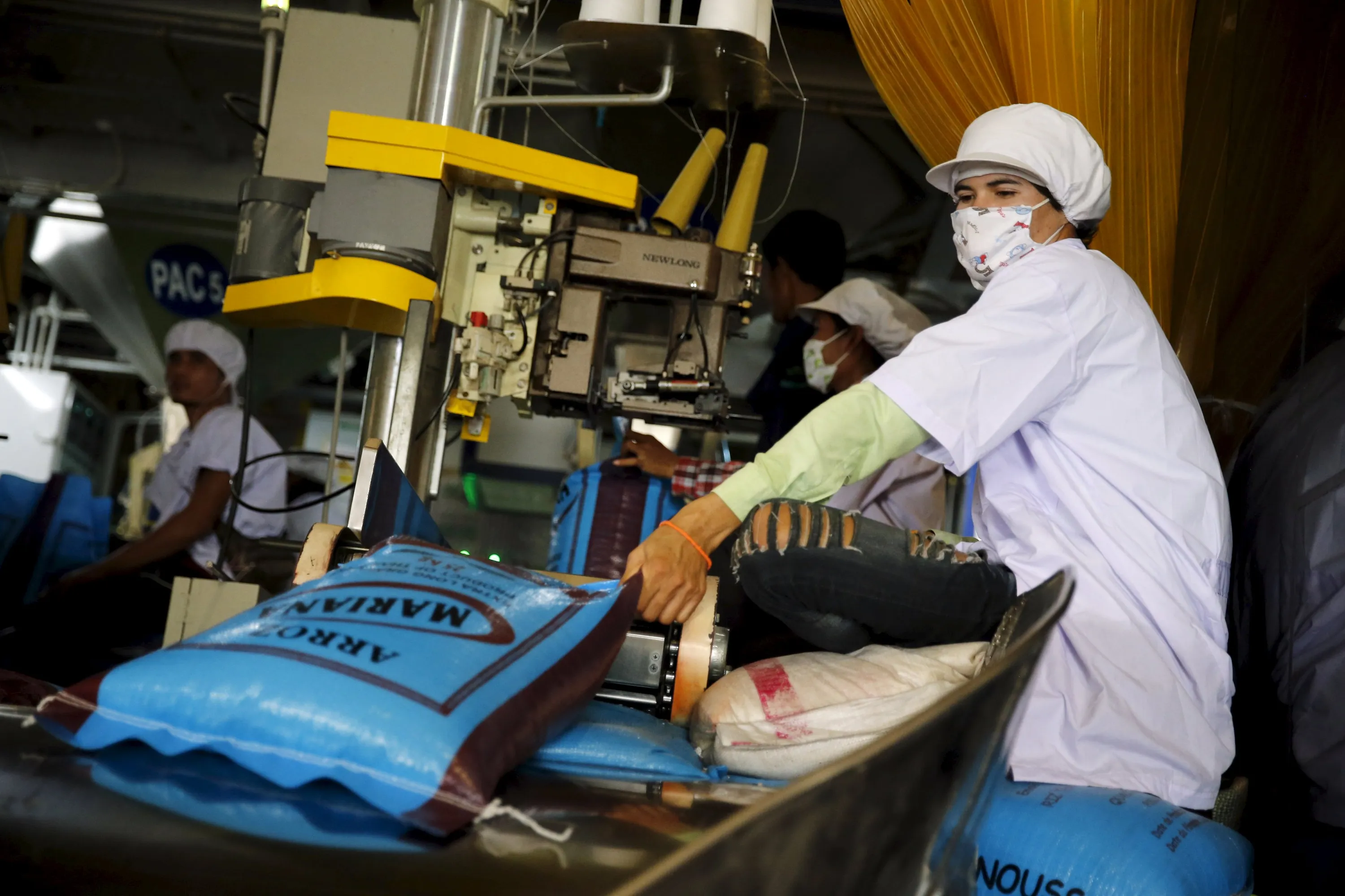 Men pack rice bags at an export rice plant in the central Chainat province in Thailand, December 16, 2015. Picture taken December 16, 2015. (Photo by Jorge Silva/Reuters)