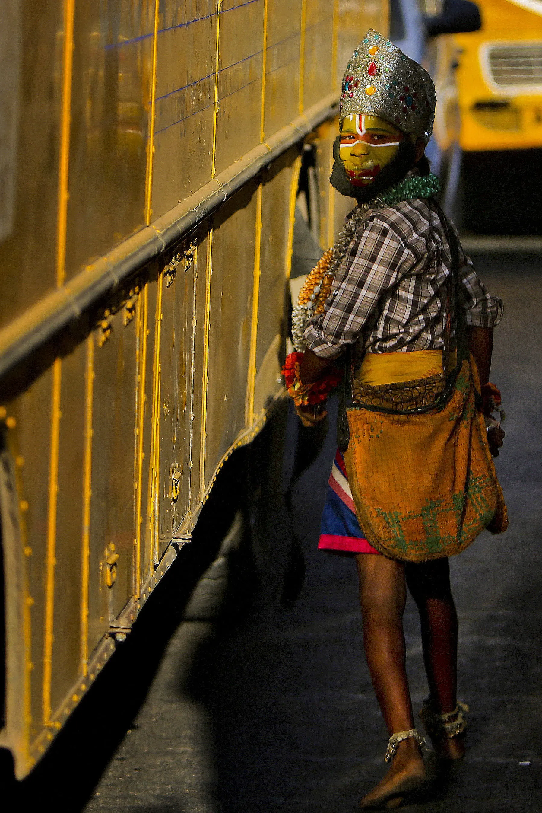 An Indian boy, seeking alms dressed as Hindu monkey god Hanuman, walks between two buses halted at a traffic intersection in Hyderabad, India, Monday, December 28, 2015. (Photo by Mahesh Kumar A./AP Photo)