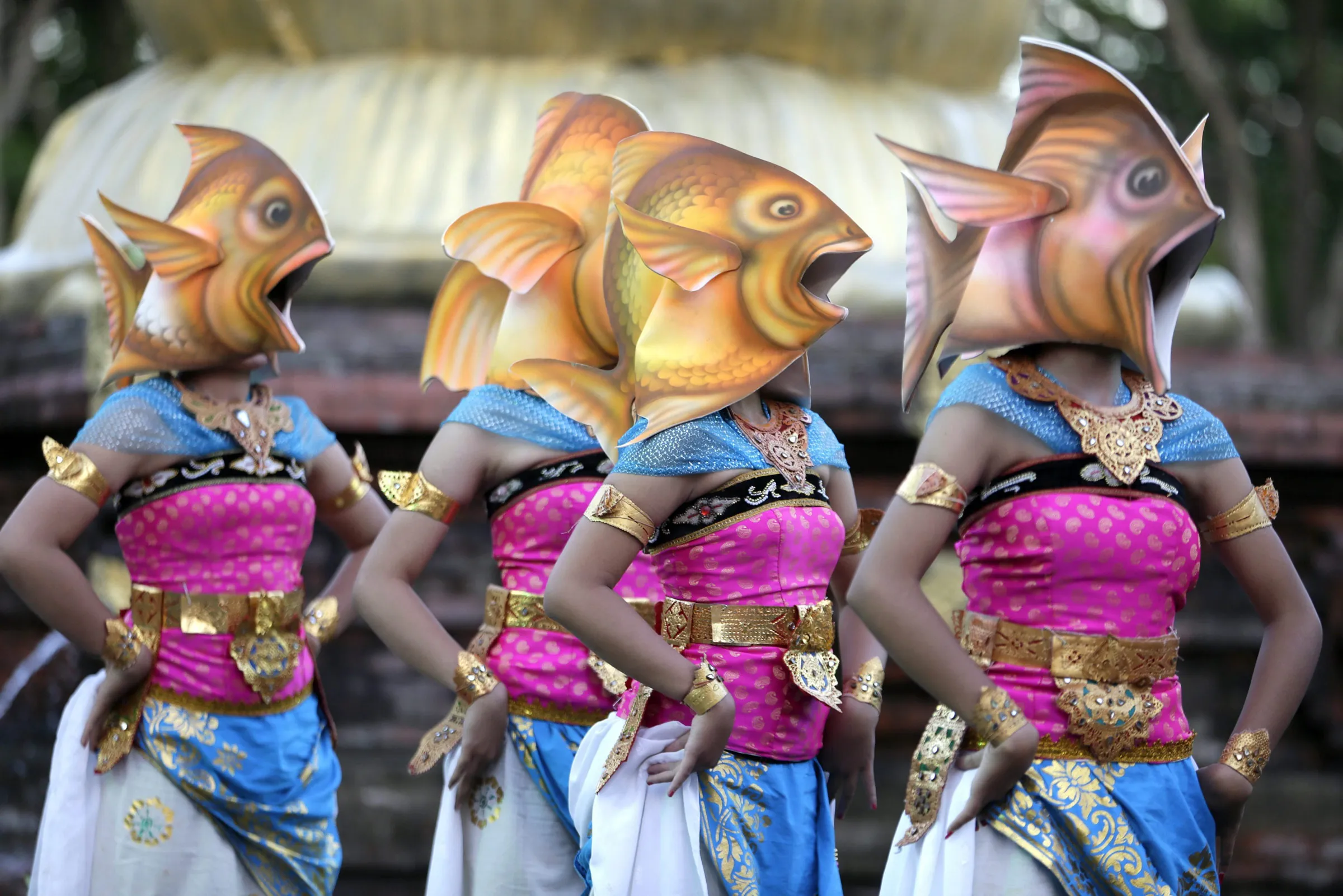 Balinese dancers wearing fish head masks perform as they take part in a cultural parade at a main road in Denpasar, Bali, Indonesia, 28 December 2015. The cultural parade is held to promote tourism in Bali. (Photo by Made Nagi/EPA)