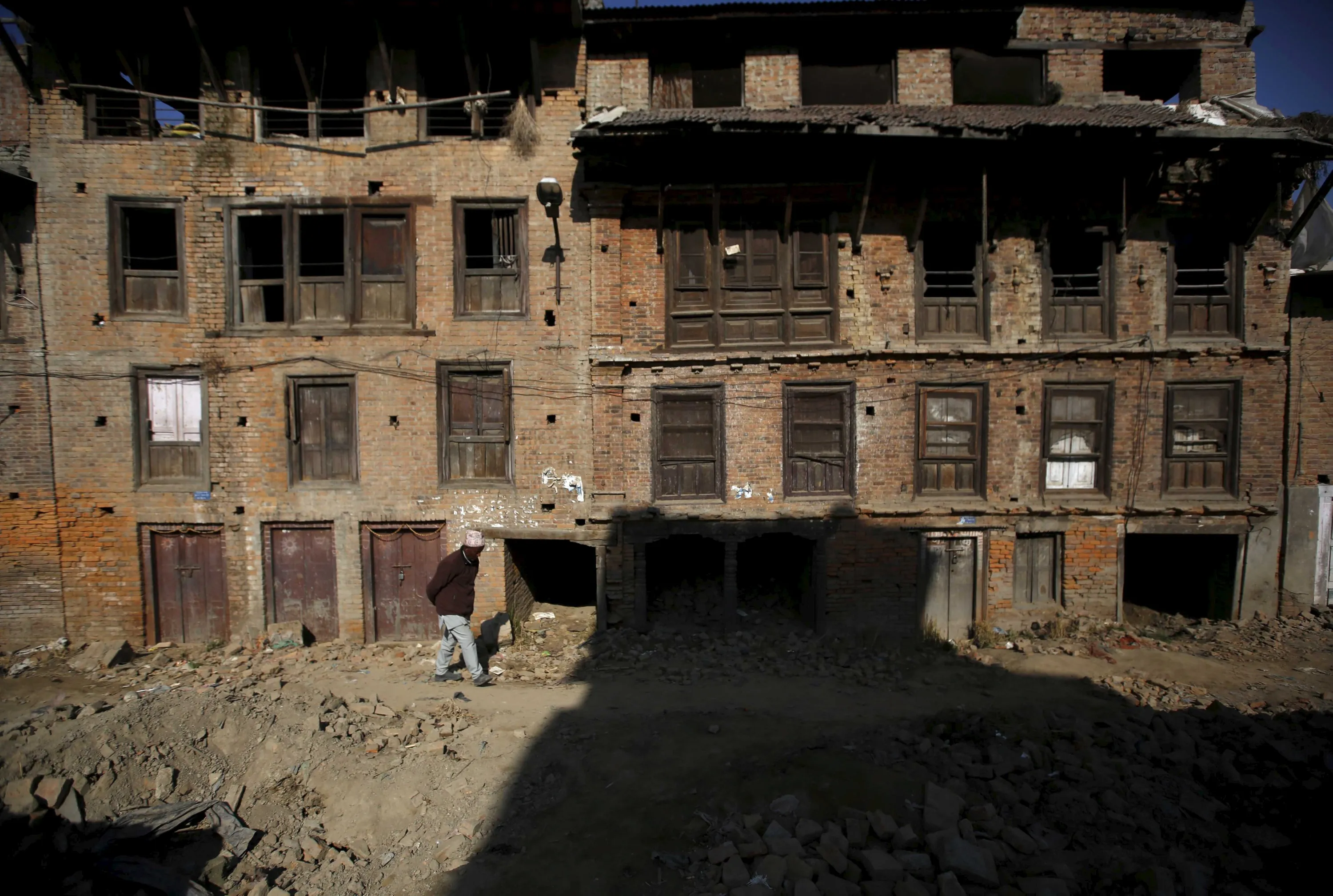 A man walks past abandoned houses damaged during the earthquake earlier this year, in Bhaktapur, Nepal December 28, 2015. (Photo by Navesh Chitrakar/Reuters)
