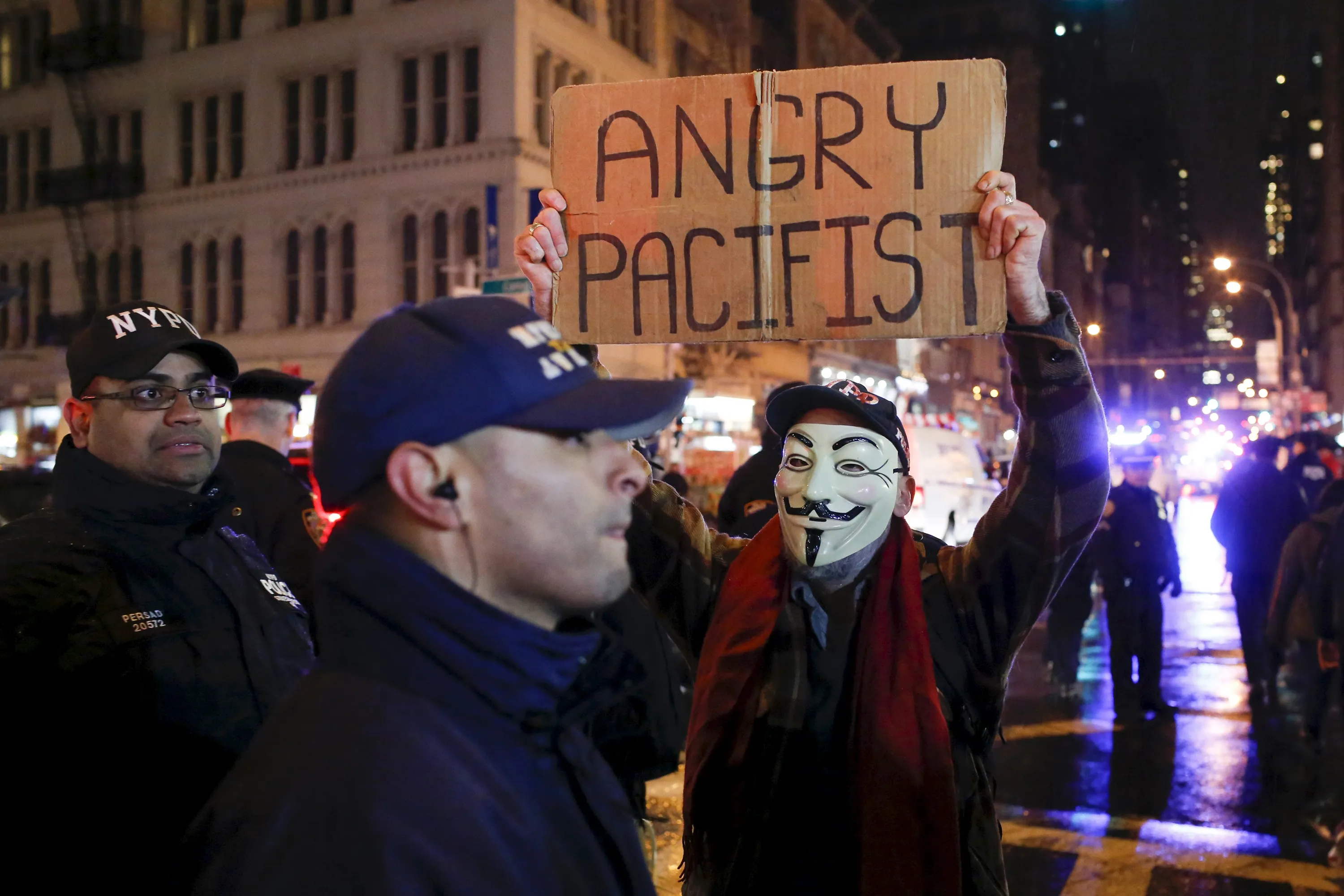 A protester holds up a sign in front of a New York Police officer while people march in a protest against the police in Manhattan, New York, December 28, 2015 after a grand jury cleared two Cleveland police officers on Monday in the November 2014 fatal shooting of 12-year-old Tamir Rice. Rice was brandishing a toy gun in a park, and a prosecutor said there were a series of mistakes but no criminal activity. (Photo by Eduardo Munoz/Reuters)