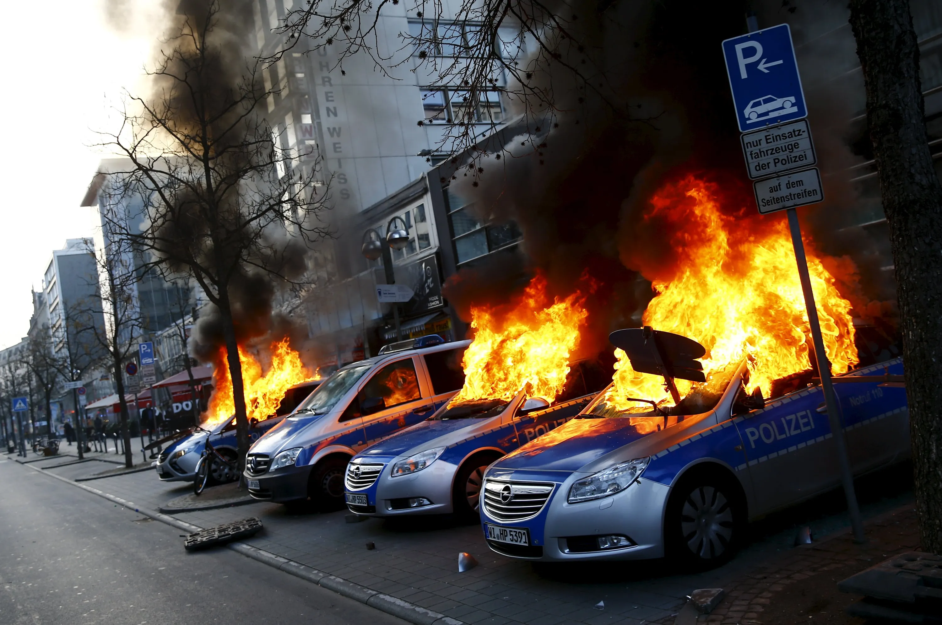 Four German police cars set on fire by anti-capitalist protesters burn near the European Central Bank (ECB) building hours before the official opening of its new headquarters in Frankfurt, Germany March 18, 2015. (Photo by Kai Pfaffenbach/Reuters)