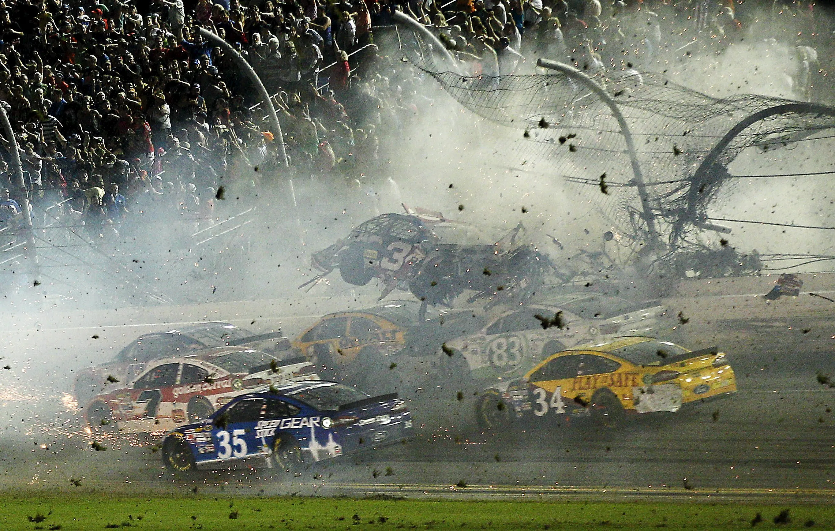 Jul 6, 2015; Daytona Beach, FL, USA; NASCAR Sprint Cup Series driver Austin Dillon car (3) crashes against the catch fence during the finish of the Coke Zero 400 at Daytona International Speedway. (Photo by Reinhold Matay/USA TODAY Sports)
