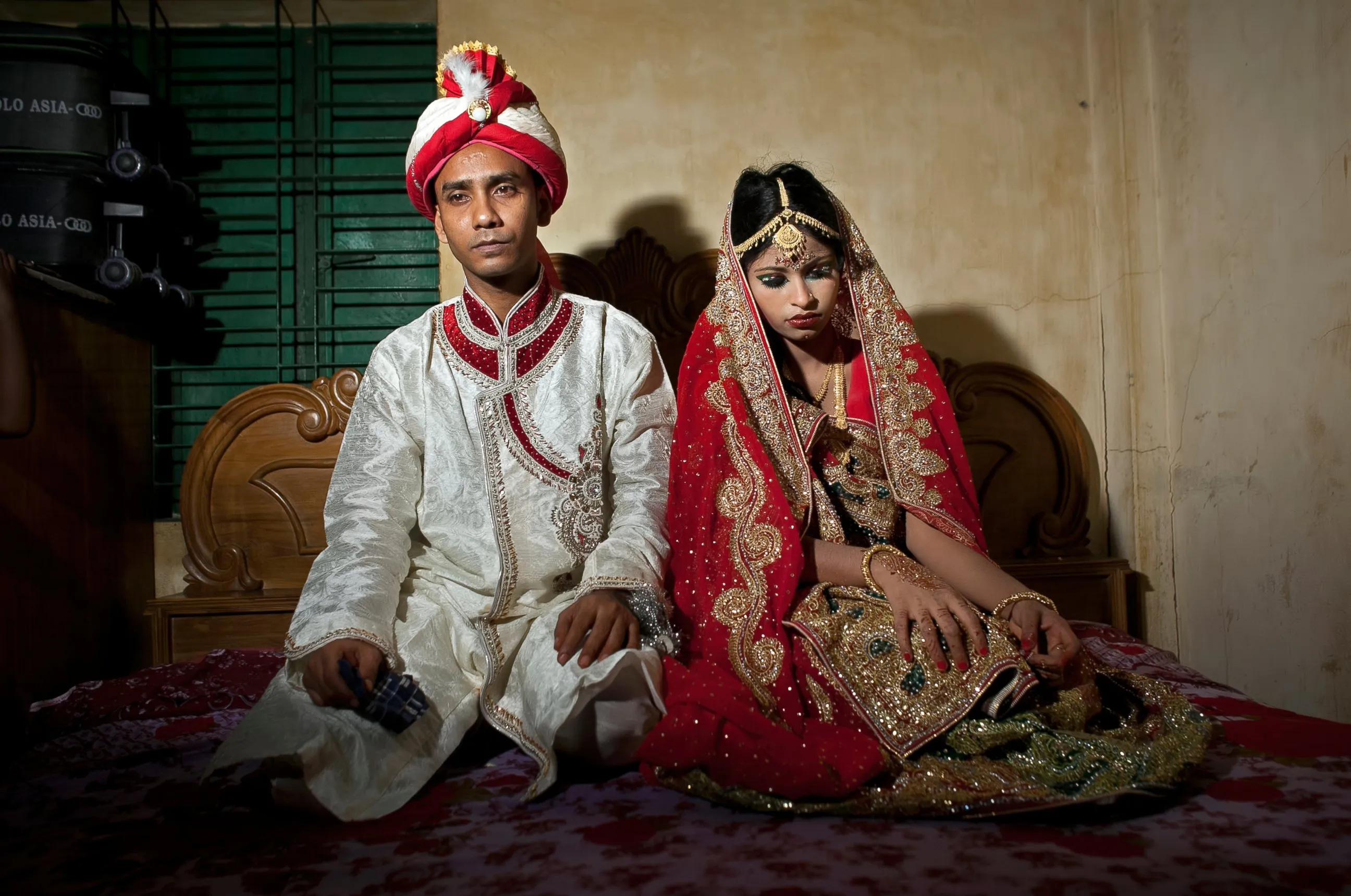Mohammad Hasamur Rahman, 32, poses for photographs with his new bride, 15-year-old Nasoin Akhter, August 20, 2015, in Manikganj, Bangladesh. (Photo by Allison Joyce/Getty Images)