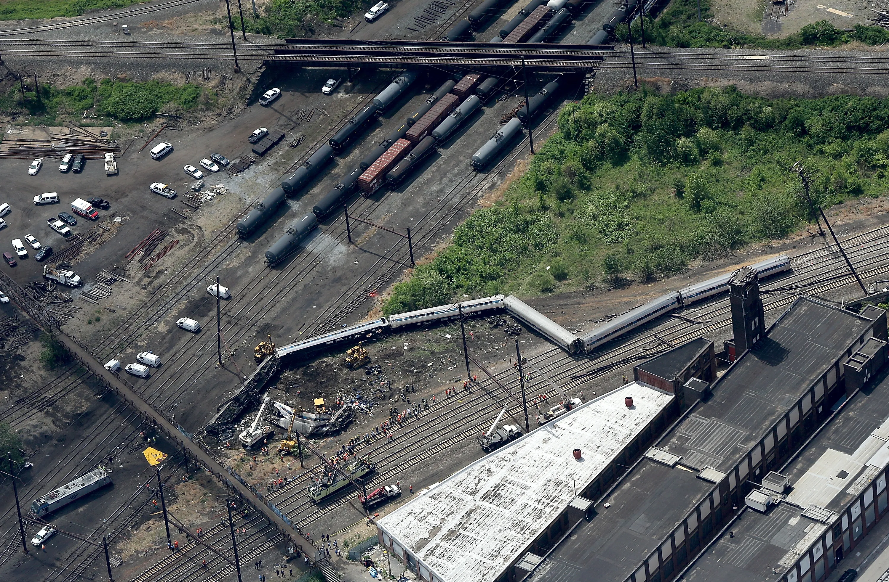 Investigators and first responders work near the wreckage of Amtrak Northeast Regional Train 188, from Washington to New York, that derailed yesterday May 13, 2015 in north Philadelphia, Pennsylvania. At least six people were killed and more than 200 others were injured in the crash. (Photo by Win McNamee/Getty Images)