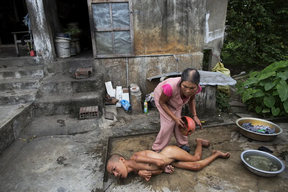 Tang Thi Thang baths her disabled son Doan Van Quy outside their family home in Truc Ly, in Vietnam's Quang Binh Province April 11, 2015. Doan Van Quy's father, a soldier who served on 12.7 mm anti-aircraft guns during the Vietnam war, said he lived in several areas that were contaminated by Agent Orange. Two of his sons were born with serious health problems and the family and local health officials link their illnesses to their father's exposure to Agent Orange. REUTERS/Damir Sagolj