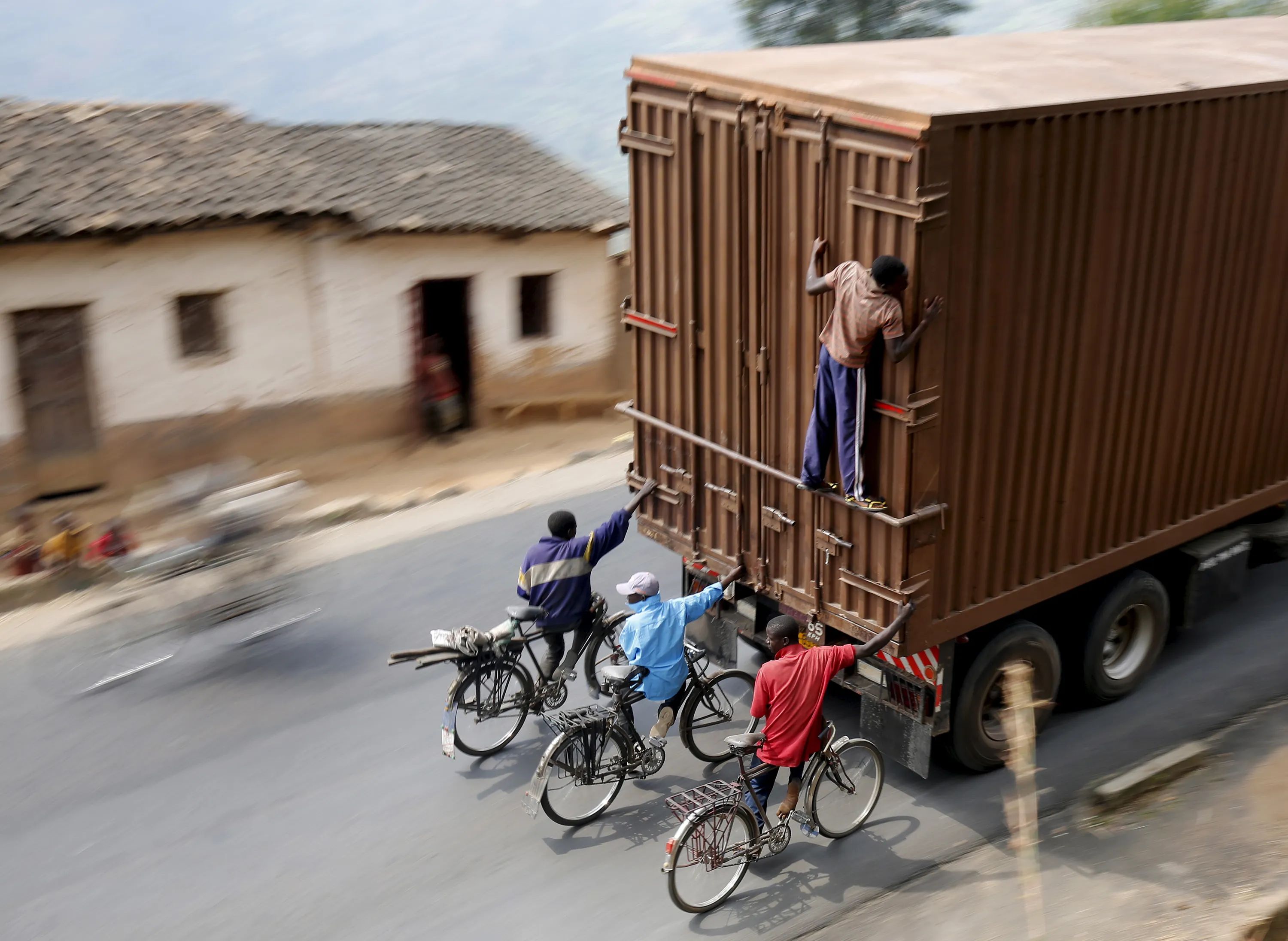 Cyclists hang on to the back of a truck outside the capital Bujumbura, July 19, 2015, as the country awaits next week's presidential elections. Each day scores of cyclists make the 45 kilometer (27 miles) downhill journey at breakneck speed from Bugarama to sell bananas, often hanging from the back of trucks for the return uphill trip. REUTERS/Mike Hutchings