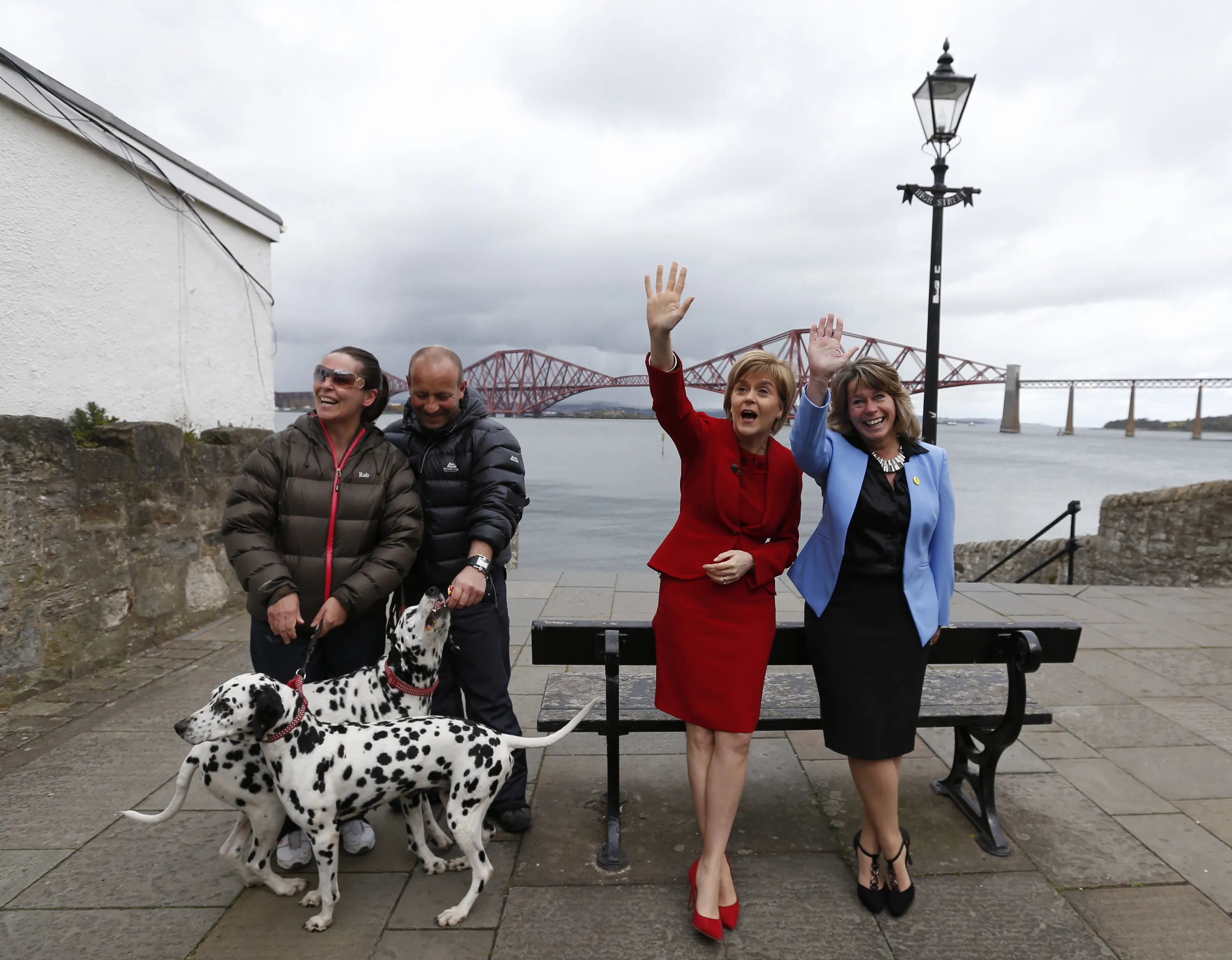 Nicola Sturgeon (2nd R), the leader of the Scottish National Party, poses with local candidate Michelle Thomson during a campaign visit in South Queensferry, Britain April 28, 2015. REUTERS/Russell Cheyne