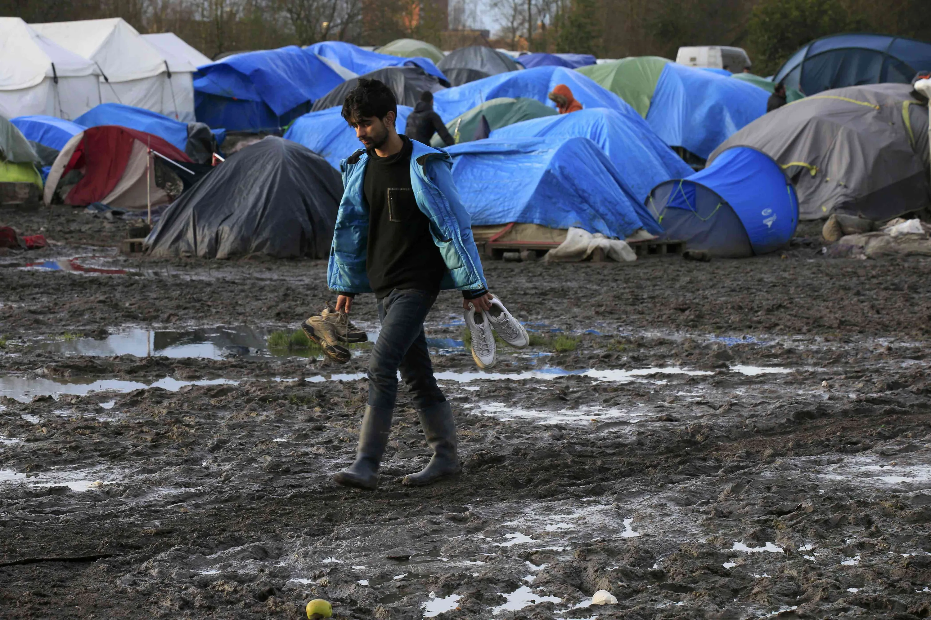 A migrant holds running shoes as he walks in a muddy field called the Grande-Synthe jungle, a camp of makeshift shelters where migrants and asylum seekers from Iraq, Kurdistan and Syria gather in Grande-Synthe, France, December 30, 2015. (Photo by Pascal Rossignol/Reuters)