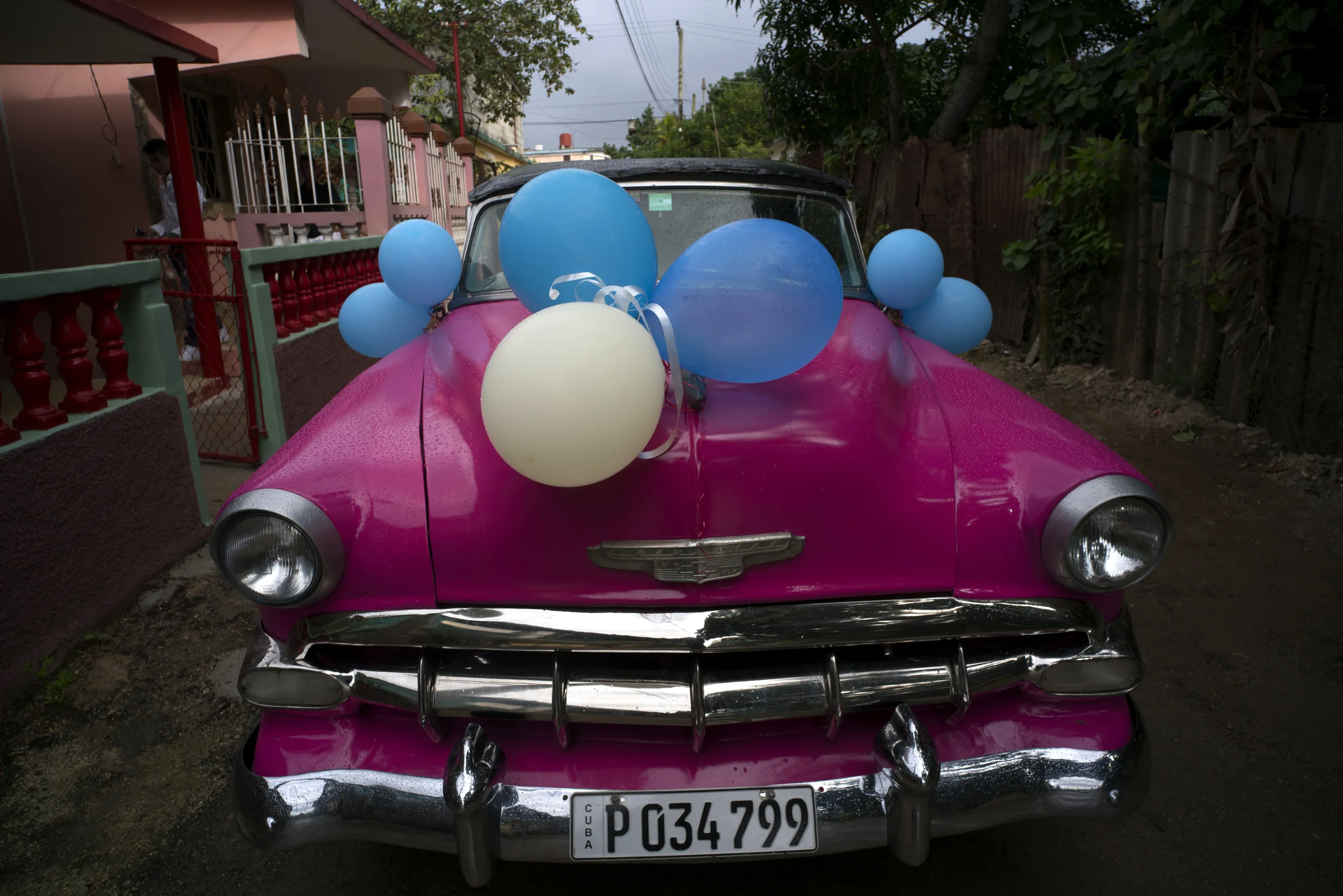 In this December 20, 2015 photo, a classic American car sits decorated with balloons before taking Daniela Santos Torres, 15, to her quinceanera party in the town of Punta Brava near Havana, Cuba. (Photo by Ramon Espinosa/AP Photo)