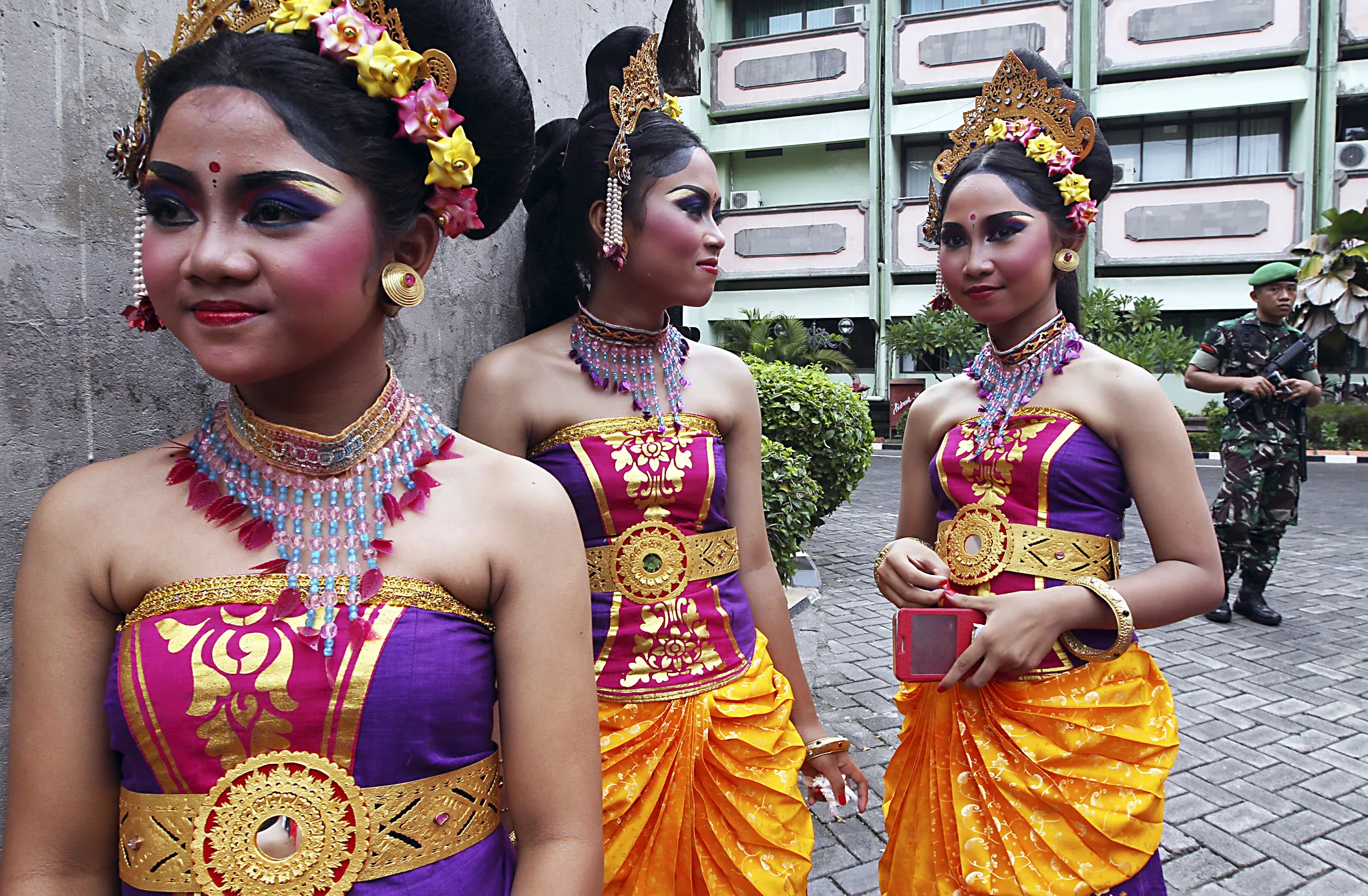 Balinese girls in traditional costumes gather during a parade for this year's last sundown in Bali island, Indonesia Thursday, December 31, 2015. (Photo by Firdia Lisnawati/AP Photo)