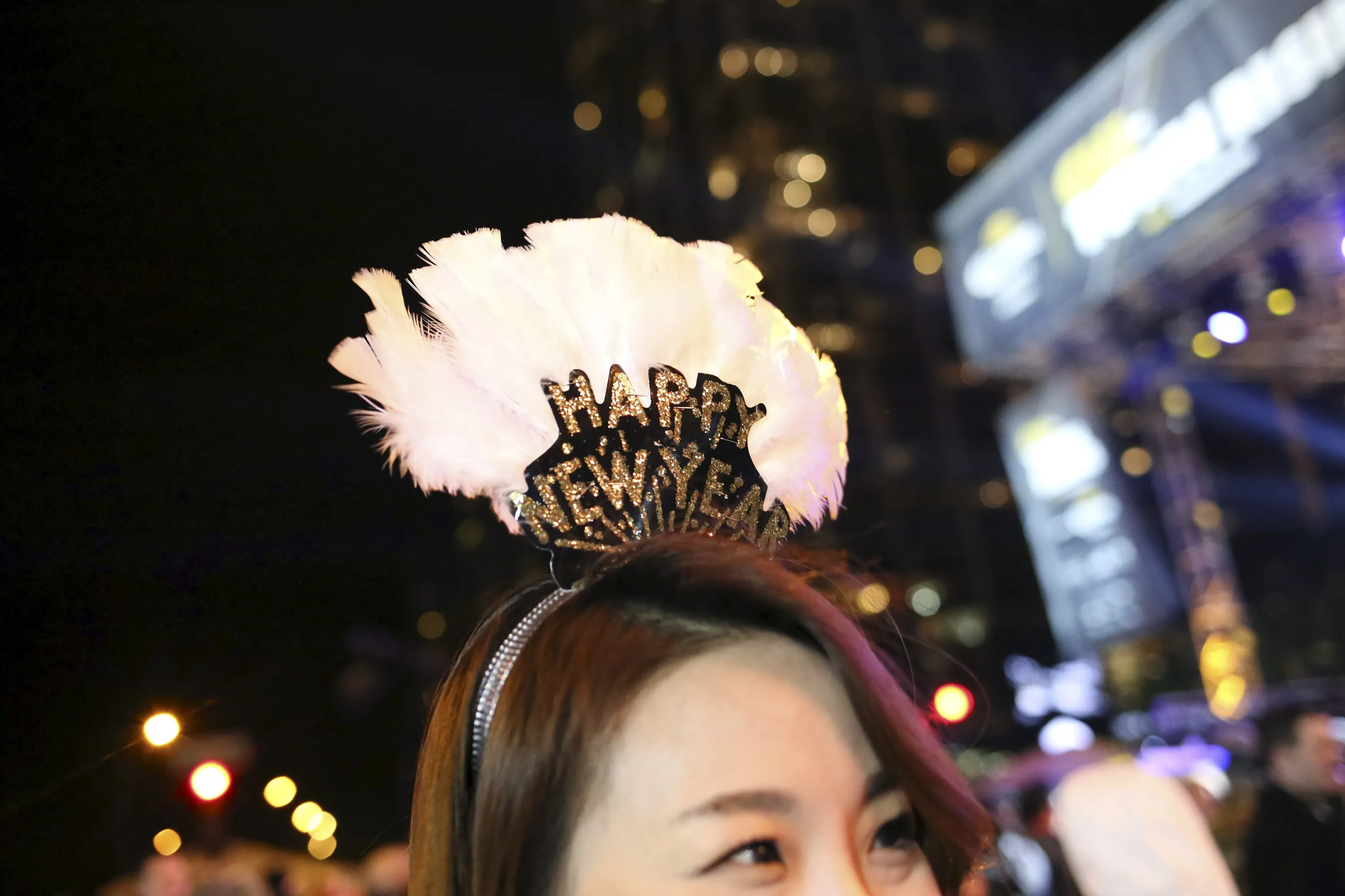 Kate Kim, 30, from Chicago, wears a holiday tiara while celebrating before the New Year at Chi-Town Rising in Chicago, Illinois, December 31, 2015. The event is set to feature a 70-foot-star that will rise to the top of the Hyatt Regency Chicago at midnight. (Photo by Alex Wroblewski/Reuters)