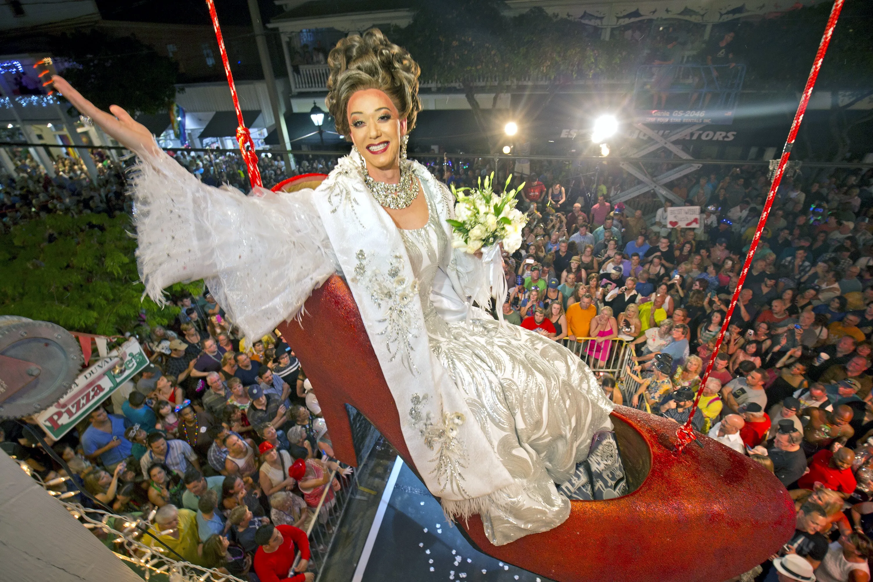 Female impersonator Gary Marion, known as Sushi, hangs in a giant replica of a woman's high heel shoe December 31, 2015, in Key West, Florida. Beginning at about 11:59 p.m. Thursday, the shoe with Sushi in it is to be lowered to Duval Street to mark the beginning of 2016. The Big Red Shoe Drop is one of several of the subtropical island city's takeoffs on New York City's Times Square ball drop. (Photo by Rob O'Neal/Reuters/Florida Keys News Bureau)