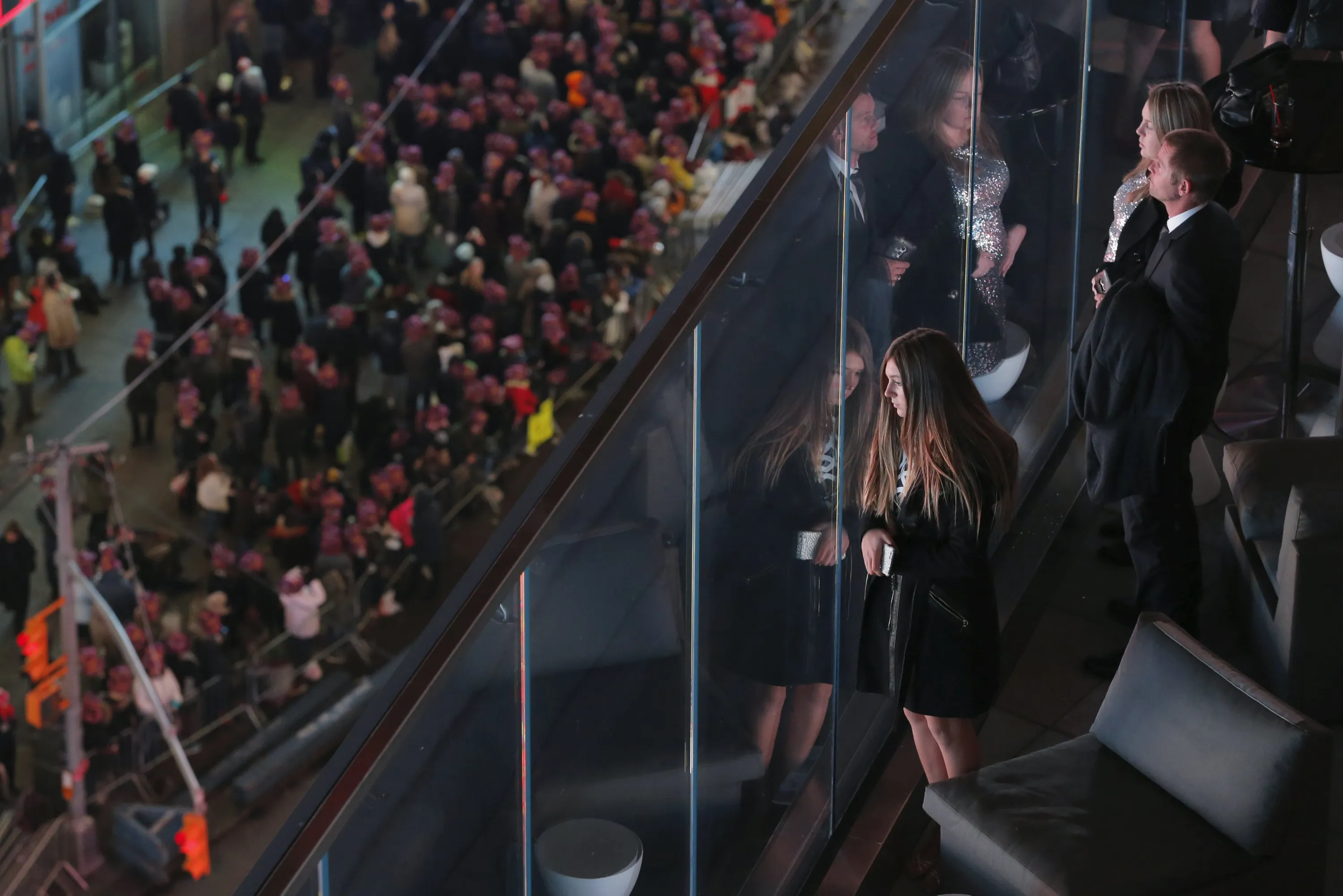 Revelers look at the gathered crowds as they wait for the start of New Year's festivities inside Times Square in New York December 31, 2015. (Photo by Lucas Jackson/Reuters)