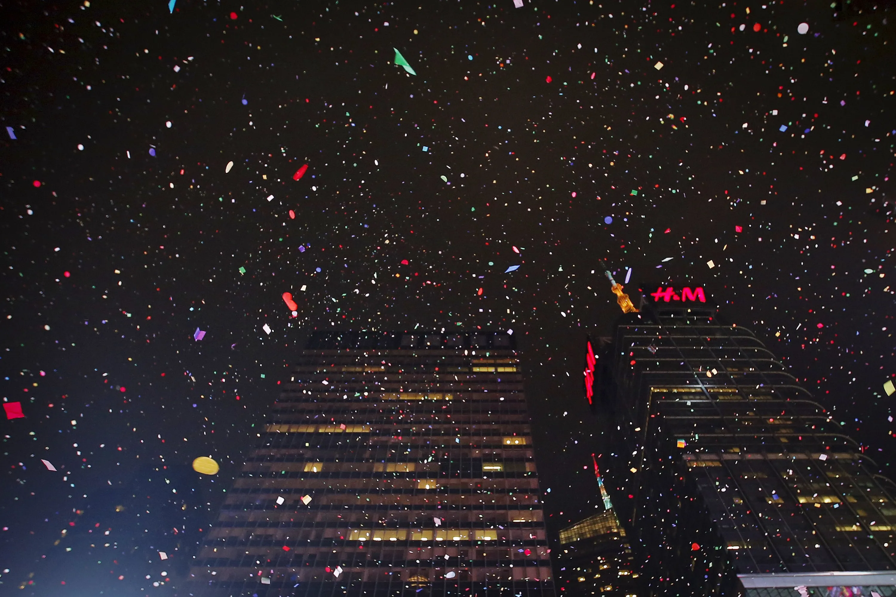 Confetti falls from the sky during New Year celebrations in Times Square in the Manhattan borough of New York, January 1, 2016. (Photo by Carlo Allegri/Reuters)