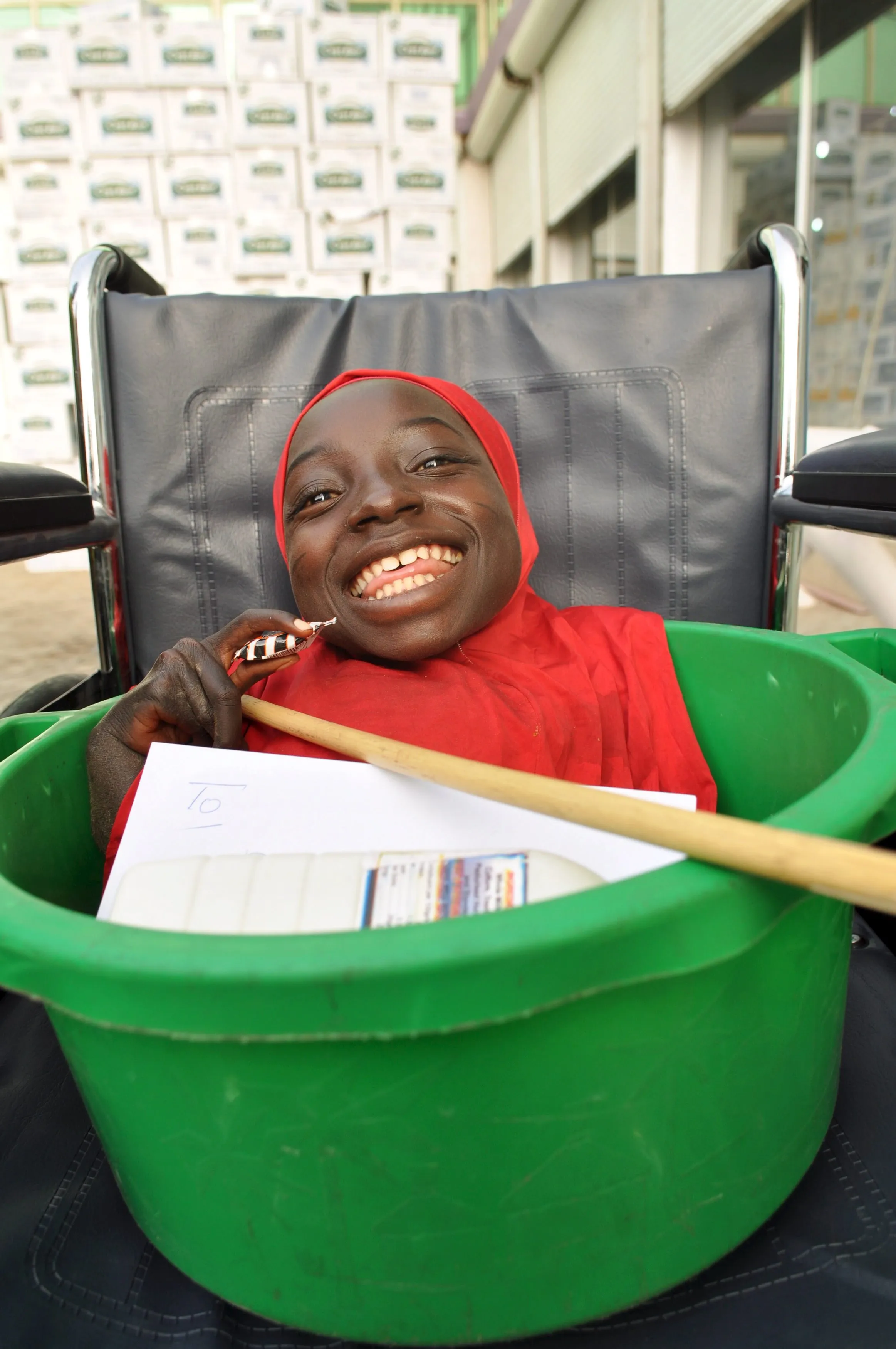 A physically challenged girl smiles she is kept in a basin on her wheelchair to seek alms from people on the street in Kano, Nigeria December 30, 2015. (Photo by Reuters/Stringer)