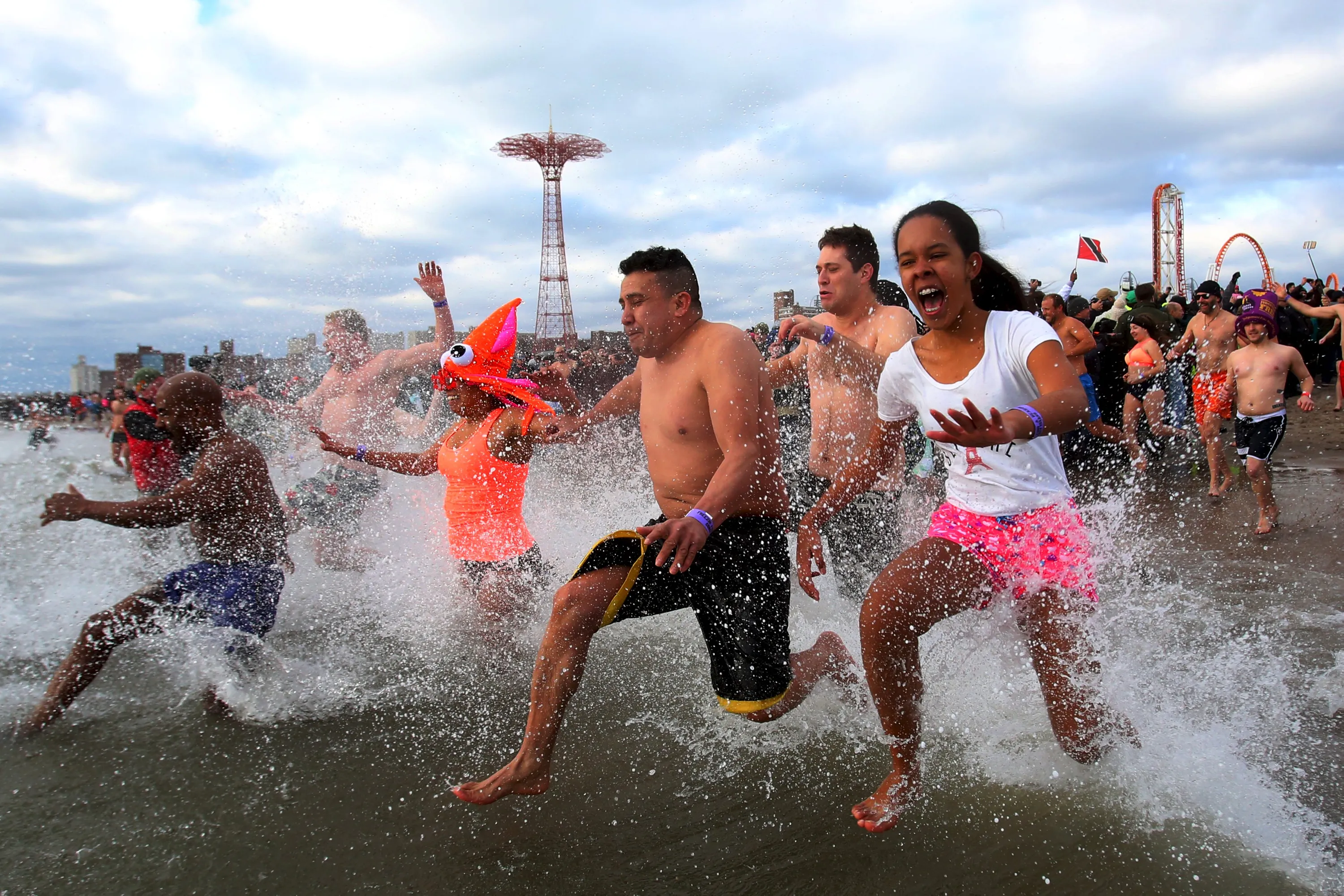 People enter the water during the Coney Island Polar Bear Club's annual New Year's Day swim at Coney Island in the Brooklyn borough of New York, January 1, 2016. (Photo by Andrew Kelly/Reuters)