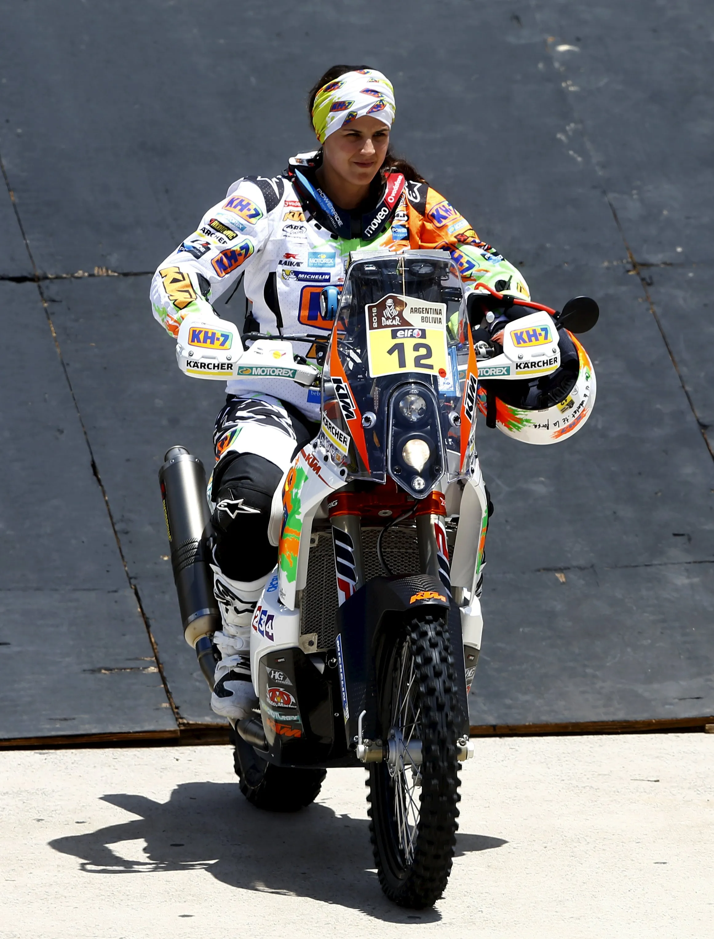 Laia Sanz of Spain rides her KTM from the podium during the departure ceremony of the 38th Dakar Rally in Buenos Aires, Argentina, January 2, 2016. (Photo by Enrique Marcarian/Reuters)