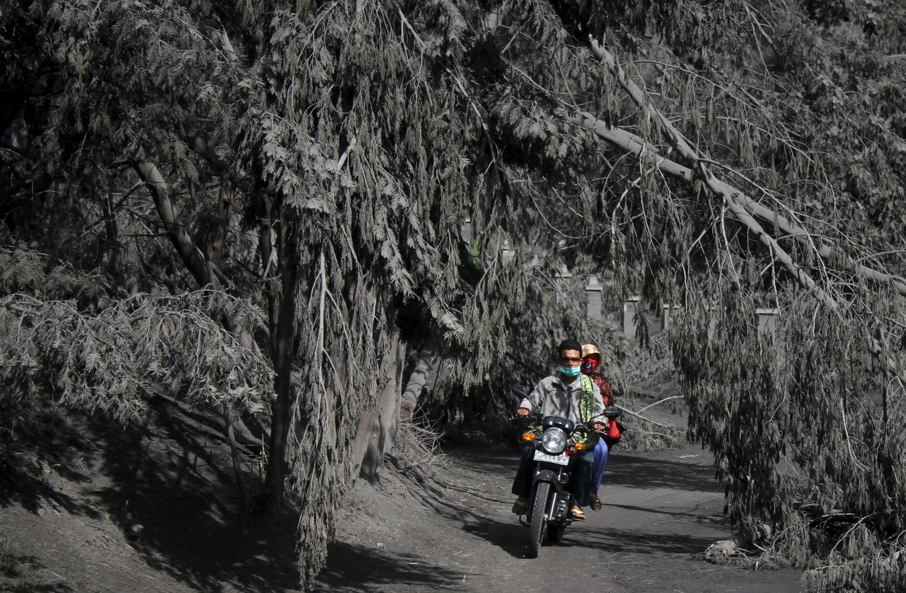 Villagers ride a motorcycles as passing trees cover by volcanic ash of Mount Bromo during eruption at Ngadisari village in Probolinggo, January 4, 2016 in this photo taken by Antara Foto. (Photo by Ari Bowo Sucipto/Reuters/Antara Foto)