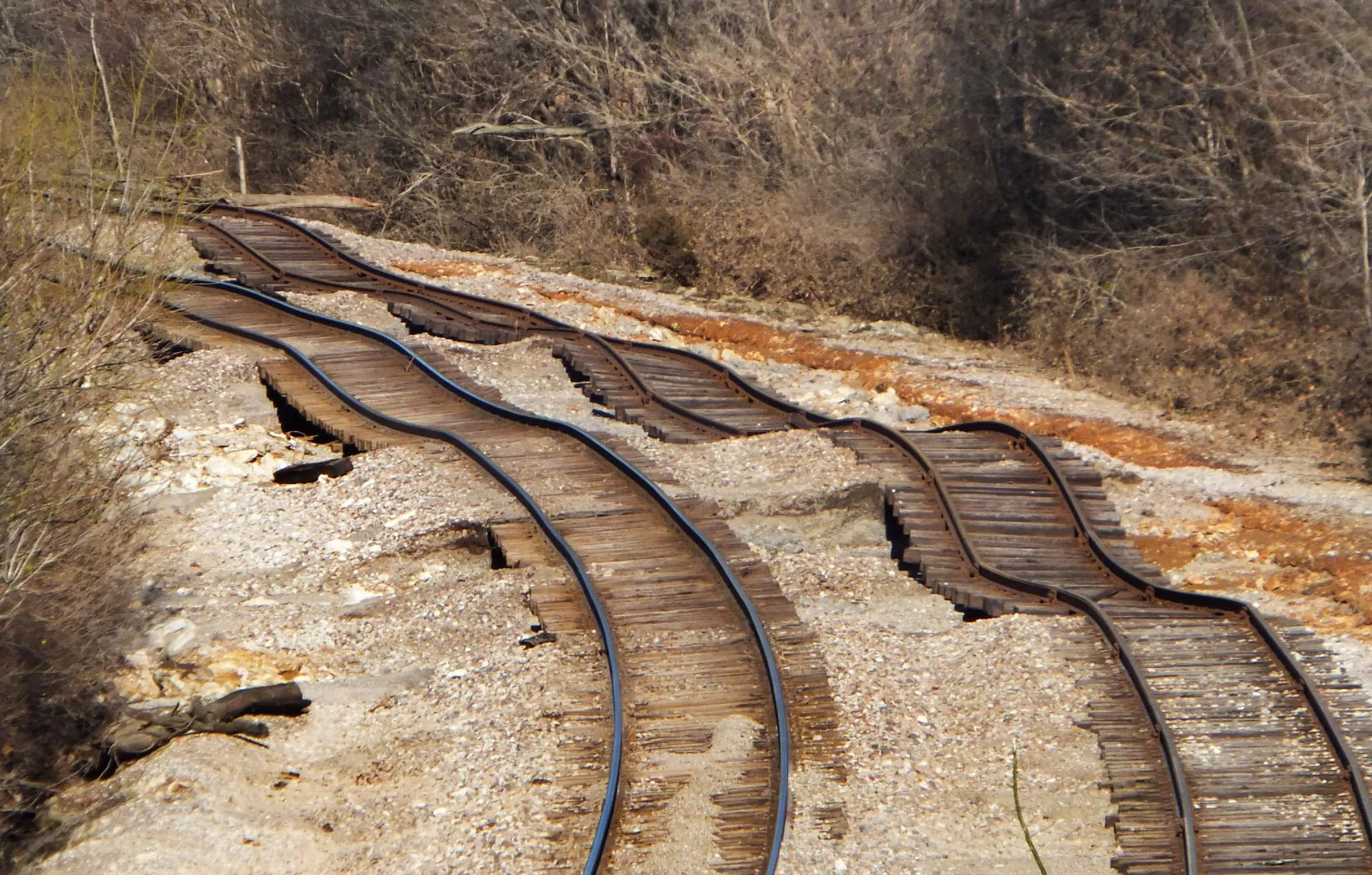 Railroad tracks, running under Interstate 44 in Eureka, Mo., near Route 66 State Park, that were undermined by floodwaters from the Meramec River and are visible on Friday, January 1, 2016. The worst of the dangerous, deadly winter flood is over in the St. Louis area, leaving residents of several water-logged communities to spend the first day of 2016 assessing damage, cleaning up and figuring out how to bounce back � or in some cases, where to live. (Photo by Jennie Crabbe/St. Louis Post-Dispatch via AP Photo)
