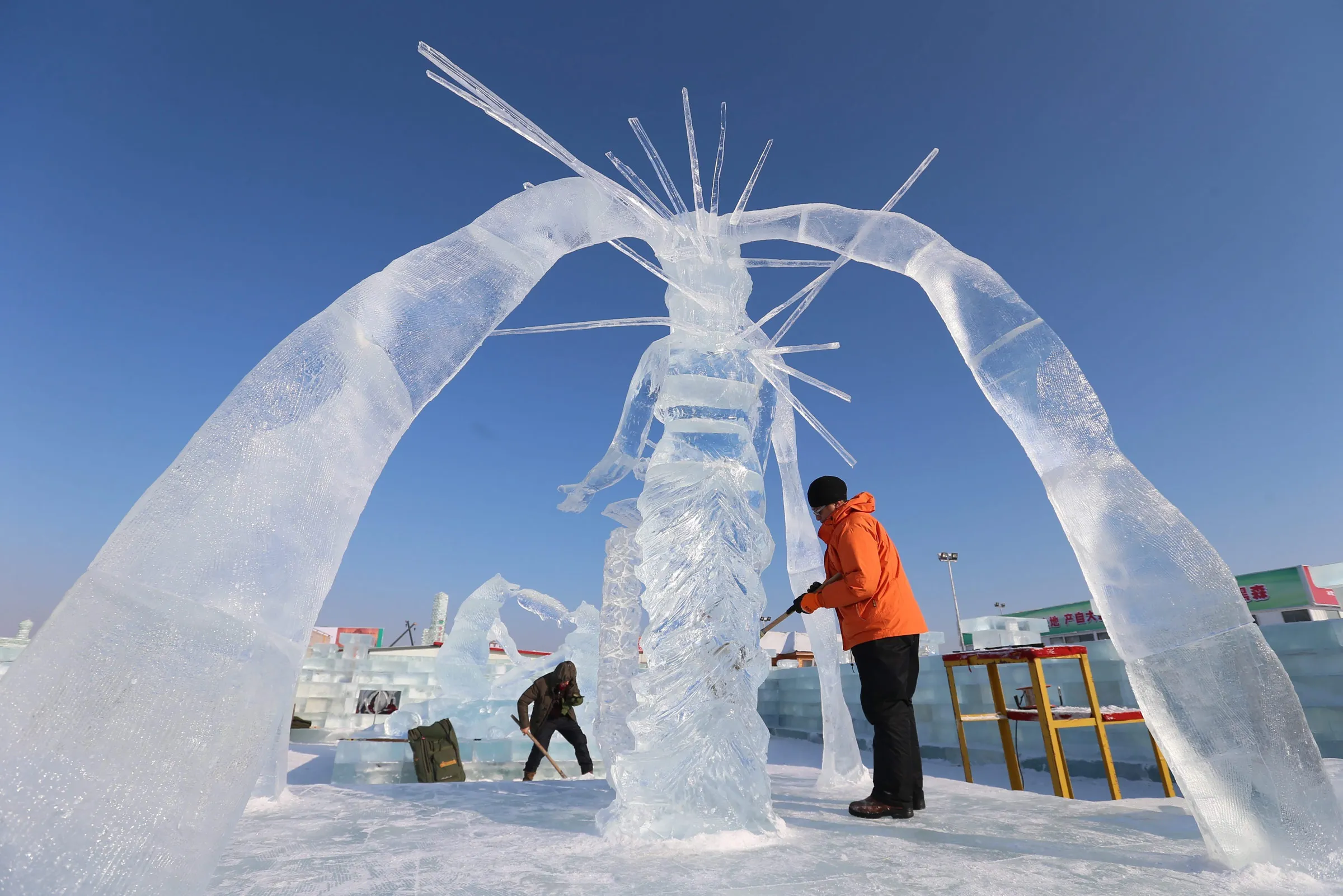 Workers carve ice art works at Harbin Ice and Snow World one day before the 32th Harbin International Ice and Snow Festival in Harbin city, China's northern Heilongjiang province, 04 January 2016. The festival will run from 05 January to 05 February. (Photo by Wu Hong/EPA)