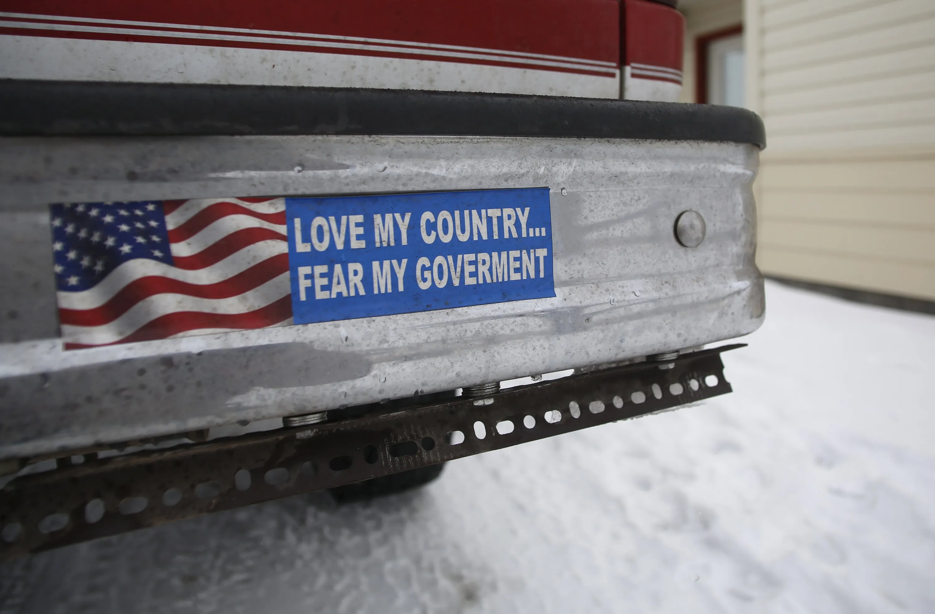 A bumper sticker on a private truck is seen in front of a residential building at the Malheur National Wildlife Refuge near Burns, Oregon, January 5, 2016. Saturday's takeover of the Malheur National Wildlife Refuge outside the town of Burns, Oregon, marked the latest protest over federal management of public land in the West, long seen by conservatives in the region as an intrusion on individual rights. (Photo by Jim Urquhart/Reuters)