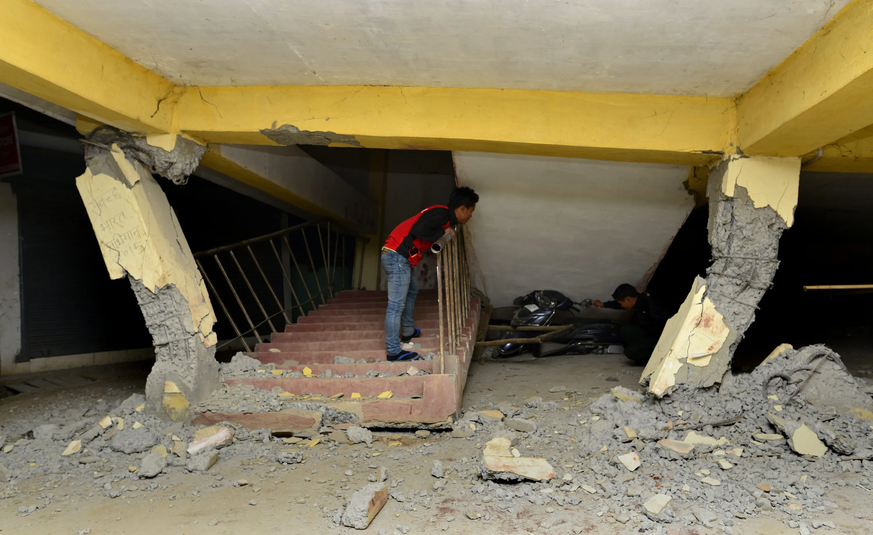 A man looks at a damaged building after a strong earthquake on the outskirts of Imphal, capital of Manipur state, north-eastern India, 05 January 2016. Nine deaths have been reported from in and around Imphal due to falling debris. Imphal has a population of 270,000, and people were jolted from their sleep and ran out of their homes in panic. (Photo by EPA/Stringer)