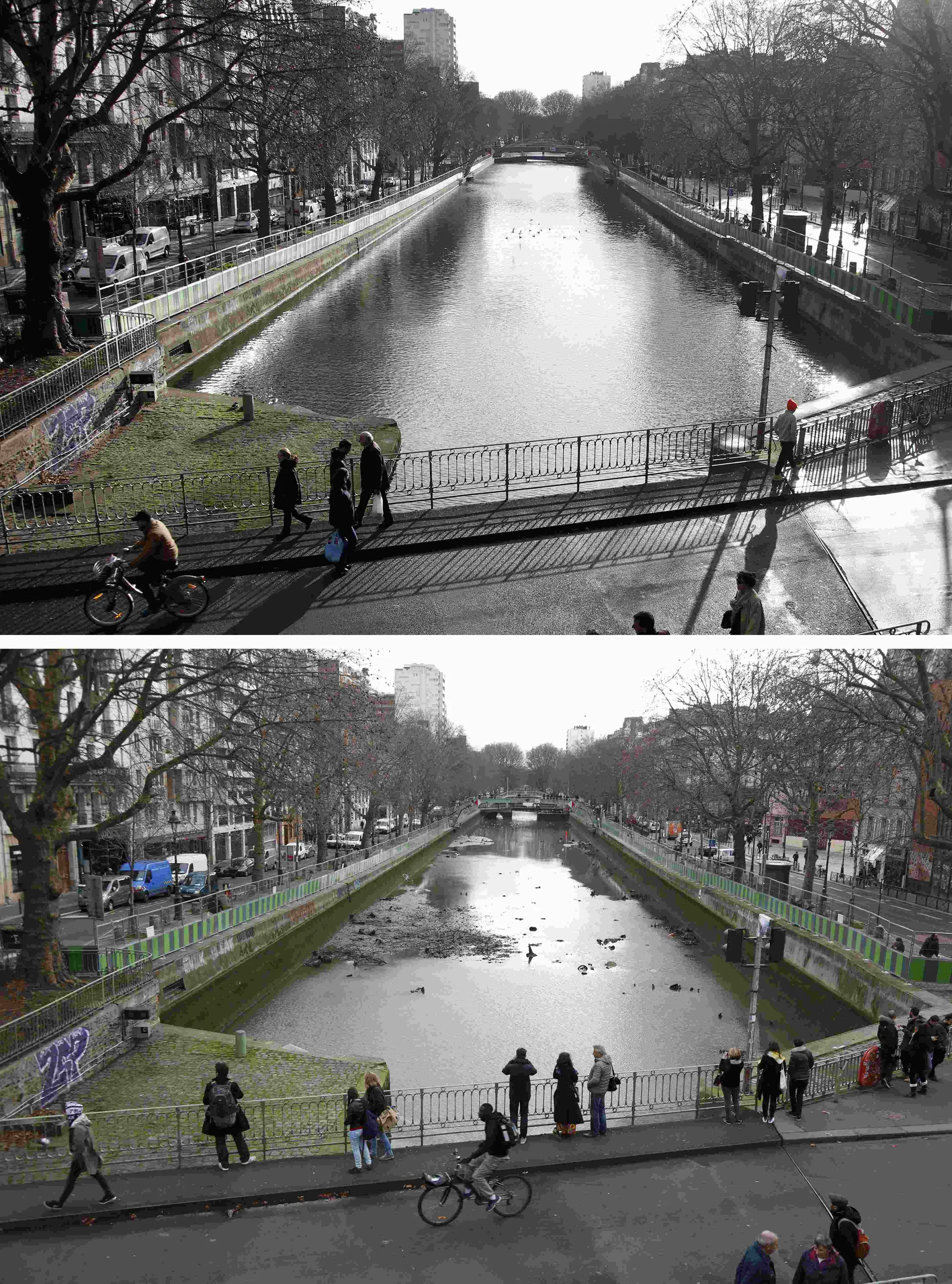 A combination picture shows the Canal Saint-Martin before the start of its draining on December 29, 2015 (top) and during the operation to clean the waterway in Paris, France, on January 5, 2016 (bottom). (Photo by Charles Platiau/Reuters)