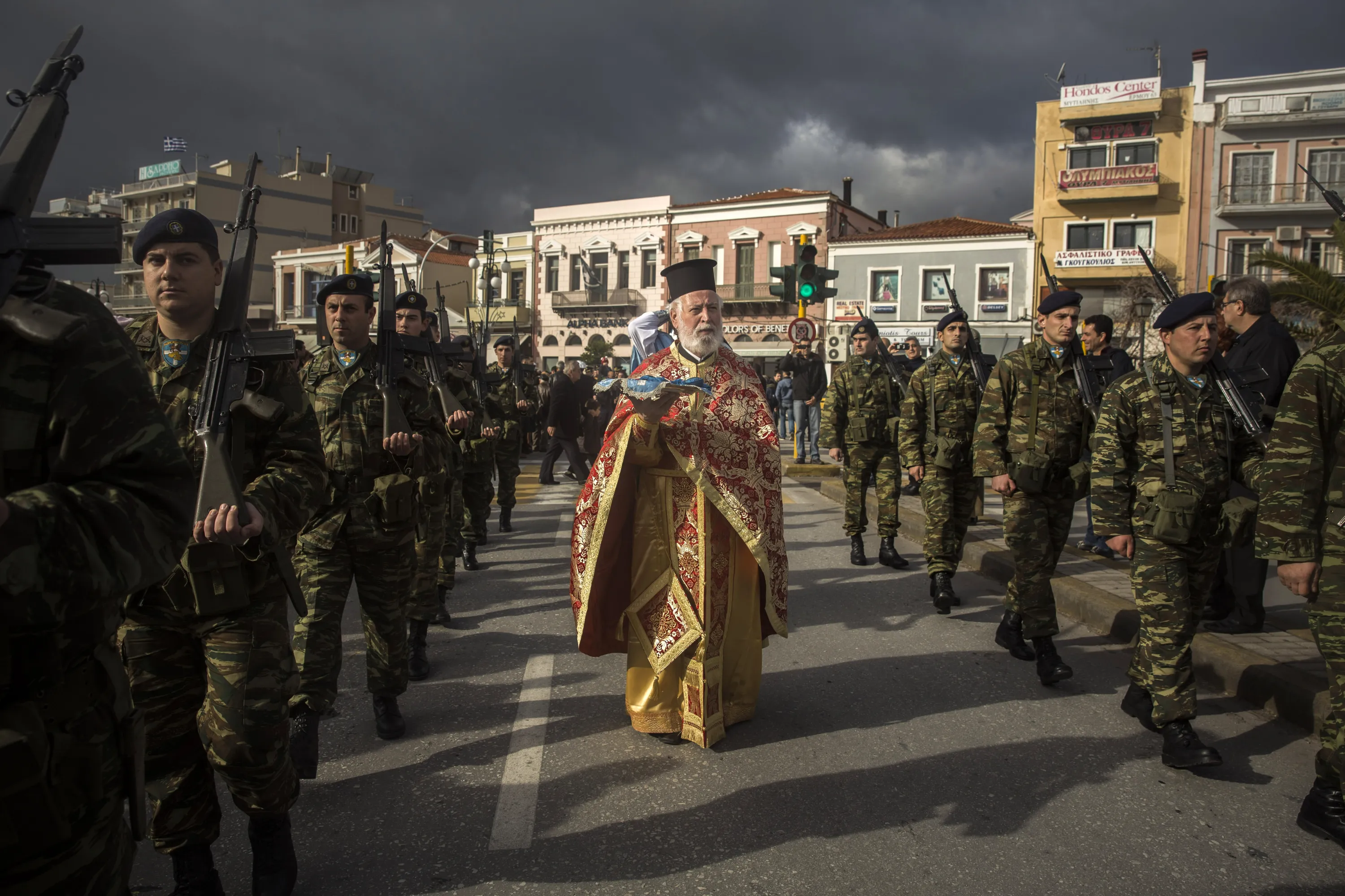 An Orthodox priest holds a cross as he is accompanied by a guard of honour during an Epiphany ceremony to bless the water in Mytilene port on the northeastern Greek island of Lesbos, Wednesday, January 6, 2016. Similar ceremonies to mark Epiphany Day were held across Greece at the sea, rivers, lakes and dams. An Orthodox priest throws a cross into the water and the swimmers race to retrieve it first. (Photo by Santi Palacios/AP Photo)