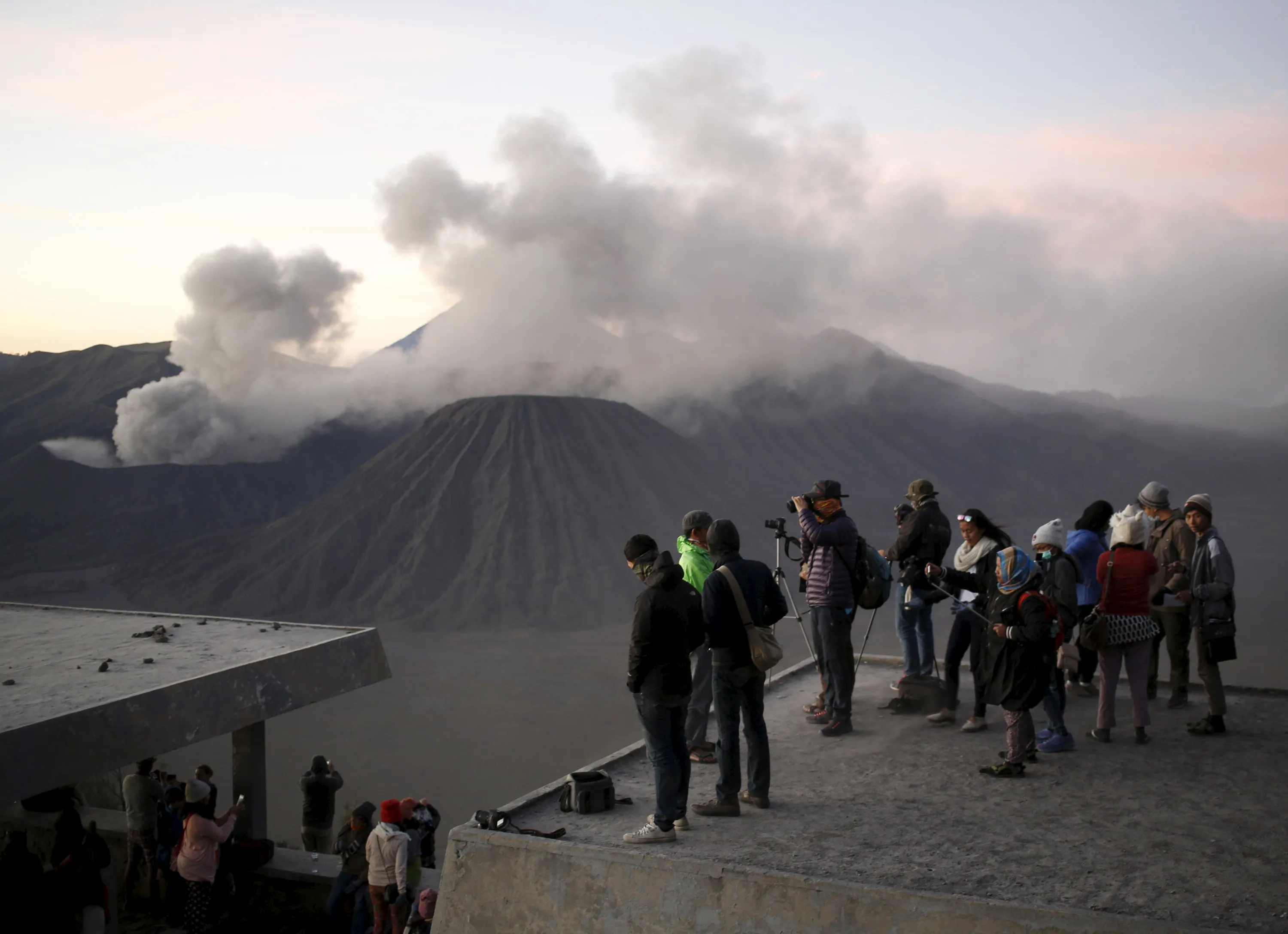 Tourists watch the sun rise as Mount Bromo erupts in the background near Ngadisari, Probolinggo, East Java, Indonesia January 6, 2016. (Photo by Darren Whiteside/Reuters)