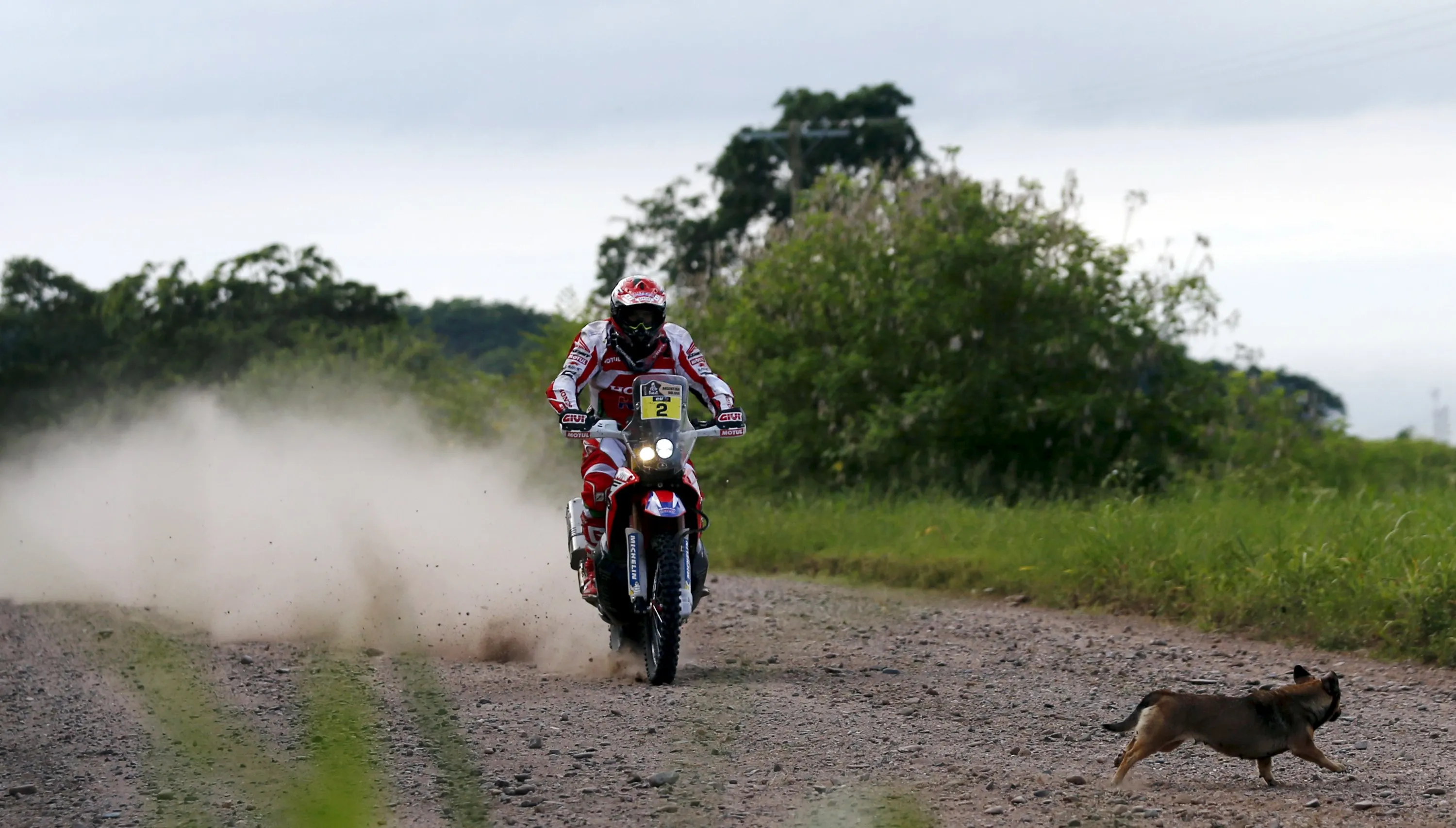 A dog crosses the road as Paulo Goncalves of Portugal rides his Honda motorcycle during the Termas de Rio Hondo-Jujuy third stage in the Dakar Rally 2016 in Tucuman province, Argentina, January 5, 2016. (Photo by Marcos Brindicci/Reuters)