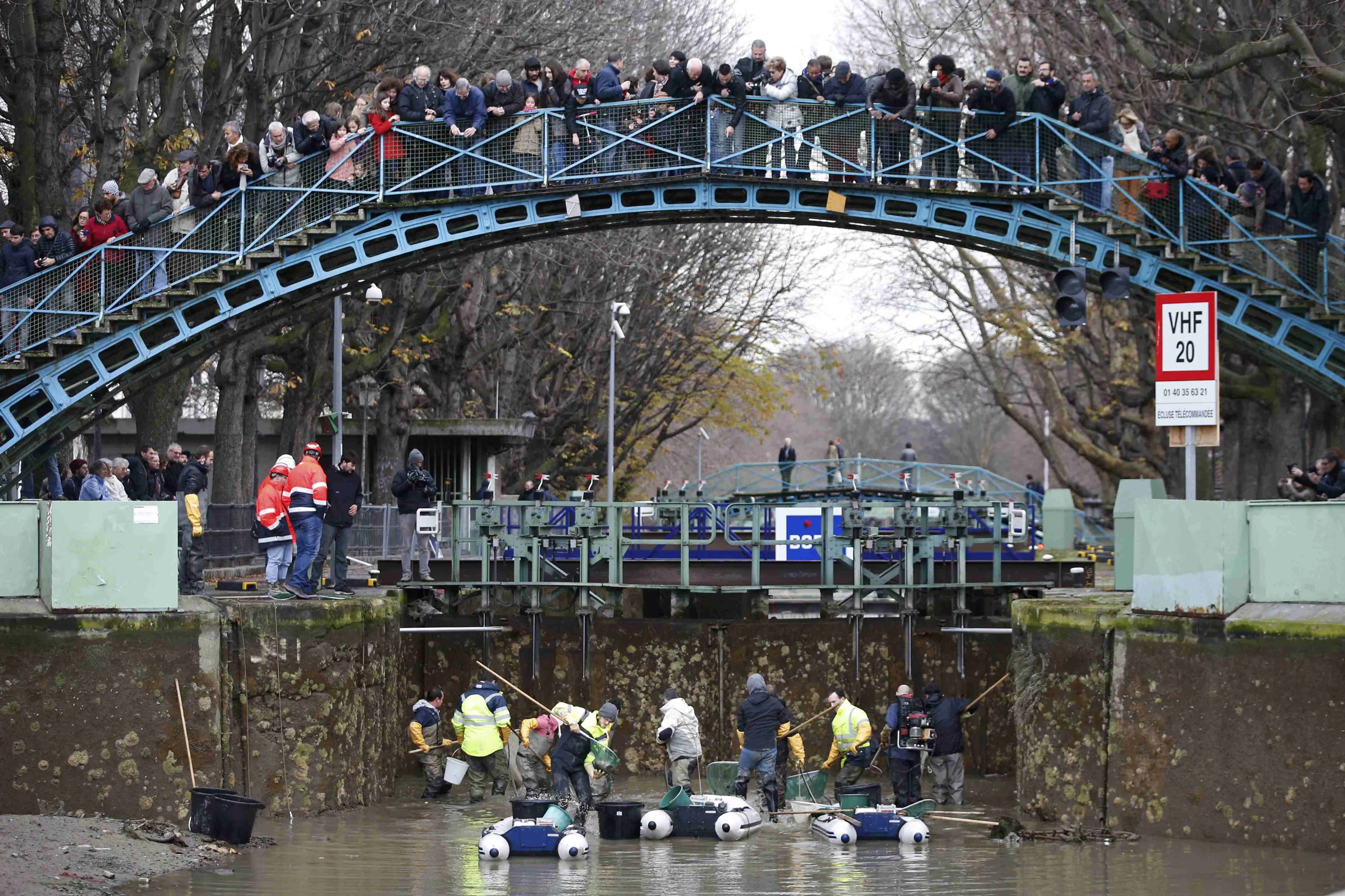 Journalists and passers-by watch as workers catch fish near a lock during the draining of the Canal Saint-Martin in Paris, France, January 6, 2016. Authorities have started a three-month cleanup operation of the canal St-Martin, in north-eastern Paris, in an attempt to refurbish its locks and remove rubbish. (Photo by Charles Platiau/Reuters)