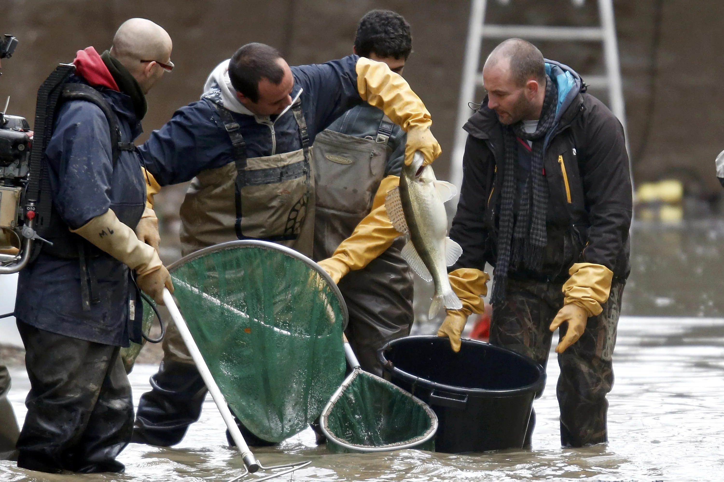 Workers hold a pike perch as they catch fish inside a lock during the draining of the Canal Saint-Martin in Paris, France, January 6, 2016. (Photo by Charles Platiau/Reuters)