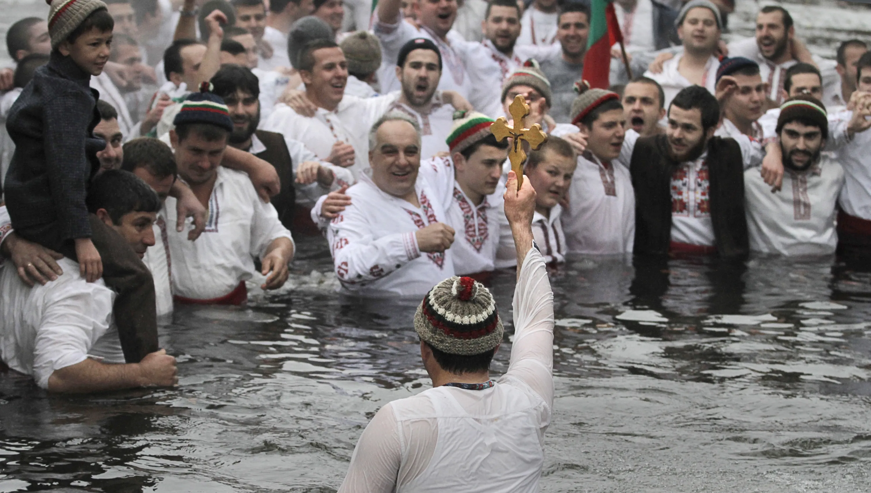 A man holds the holy cross as Bulgarians sing and dance in the icy waters of the Tundzha river, as they celebrate Epiphany day in the town of Kalofer, Wednesday, January 6, 2016. Traditionally, an Eastern Orthodox priest throws a cross into the river and it is believed that the one who retrieves it will be healthy through the year. (Photo by Valentina Petrova/AP Photo)
