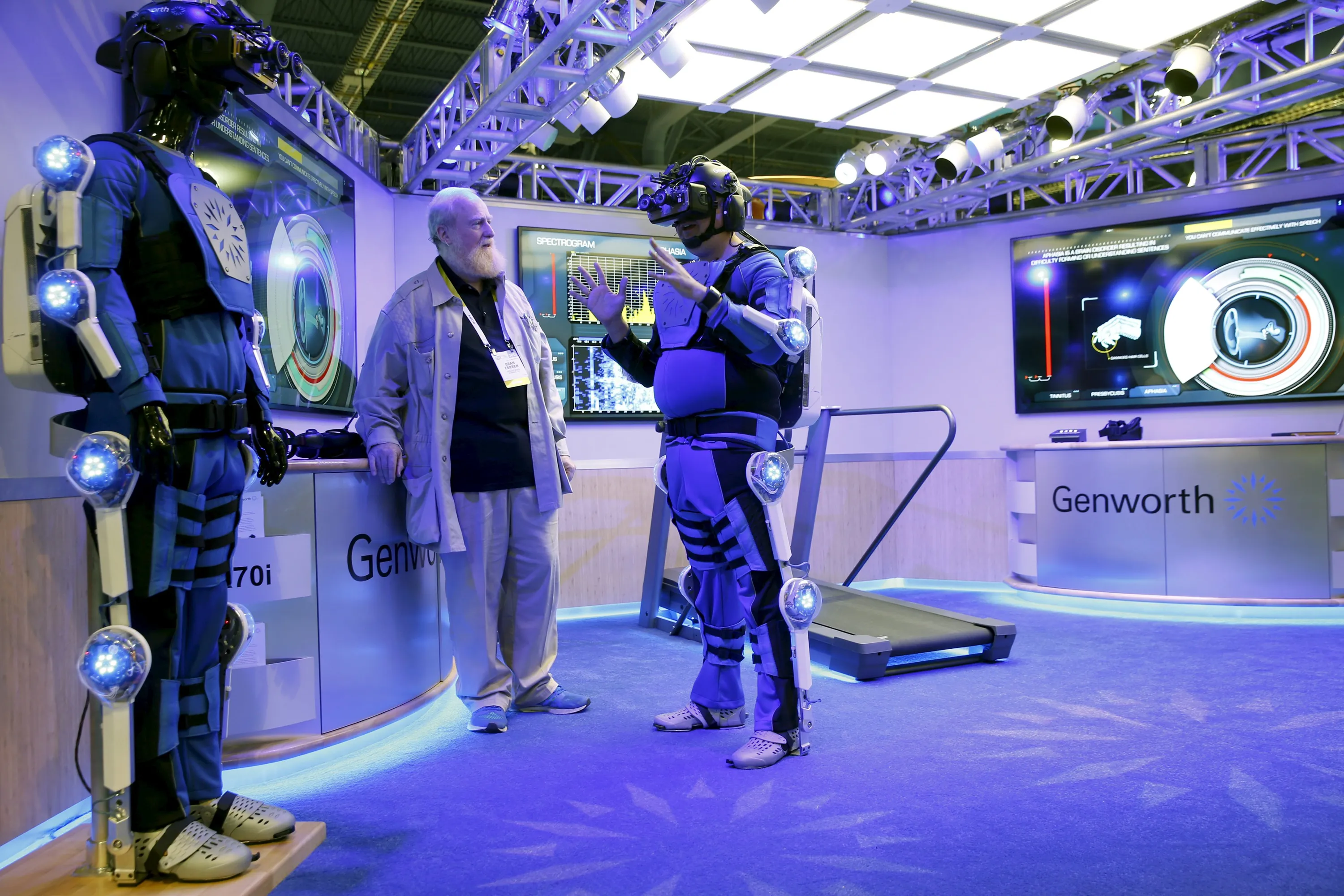 Bran Ferren (C), founder of Applied Minds, listens to a journalist dressed in an R70i aging suit during a preview of the Genworth booth at the 2016 CES trade show in Las Vegas, Nevada, January 5, 2016. The suits simulate various aging conditions and will be used in a national tour to educate and build empathy for the aging process, said spokeswoman Alexandra Osorio. (Photo by Steve Marcus/Reuters)
