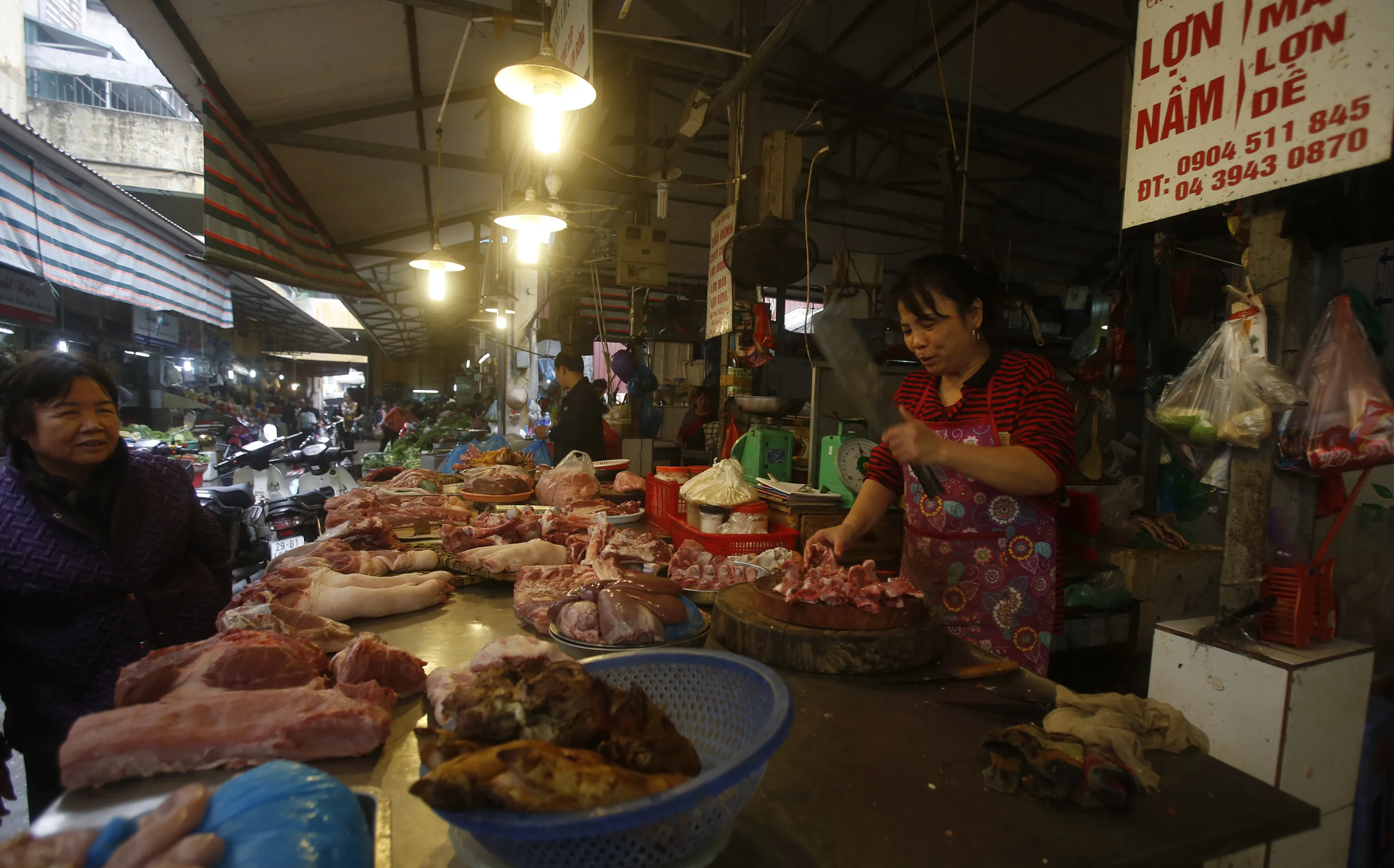 A pork seller (R) chops bones for sale at a market in Hanoi, Vietnam December 24, 2015. (Photo by Reuters/Kham)