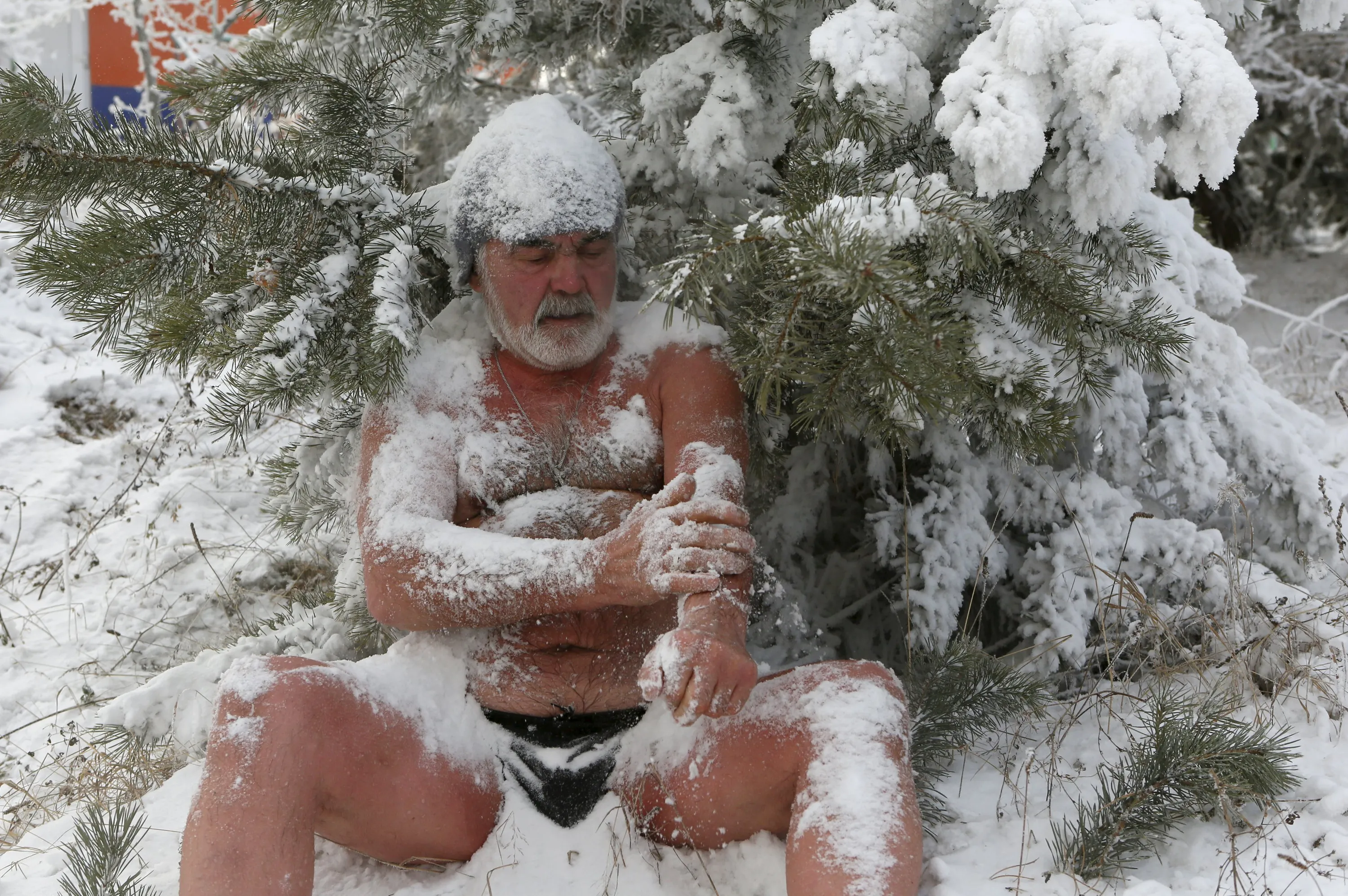 Nikolai Bocharov, 77, a member of the Cryophile winter swimmers club, rubs snow on his body as he sits on a snowdrift after bathing in the icy water of the Yenisei River in the Siberian city of Krasnoyarsk, Russia, November 21, 2015. The air temperature was around minus 27 degrees Celsius. Bocharov started winter swimming while doing military service in Germany. "When I came home from the army, I made an ice hole in the Yenisei and bathed there," he says. "My wife doesn't understand me and doesn't share this hobby of mine. My friends sneer at me and wait for me to grow wiser." "I never feel any cold or discomfort and I can stay in cold water for a long time," he says. "When I leave the water I feel a prickling sensation all over my body, it feels like I am ready to fly". (Photo by Ilya Naymushin/Reuters)
