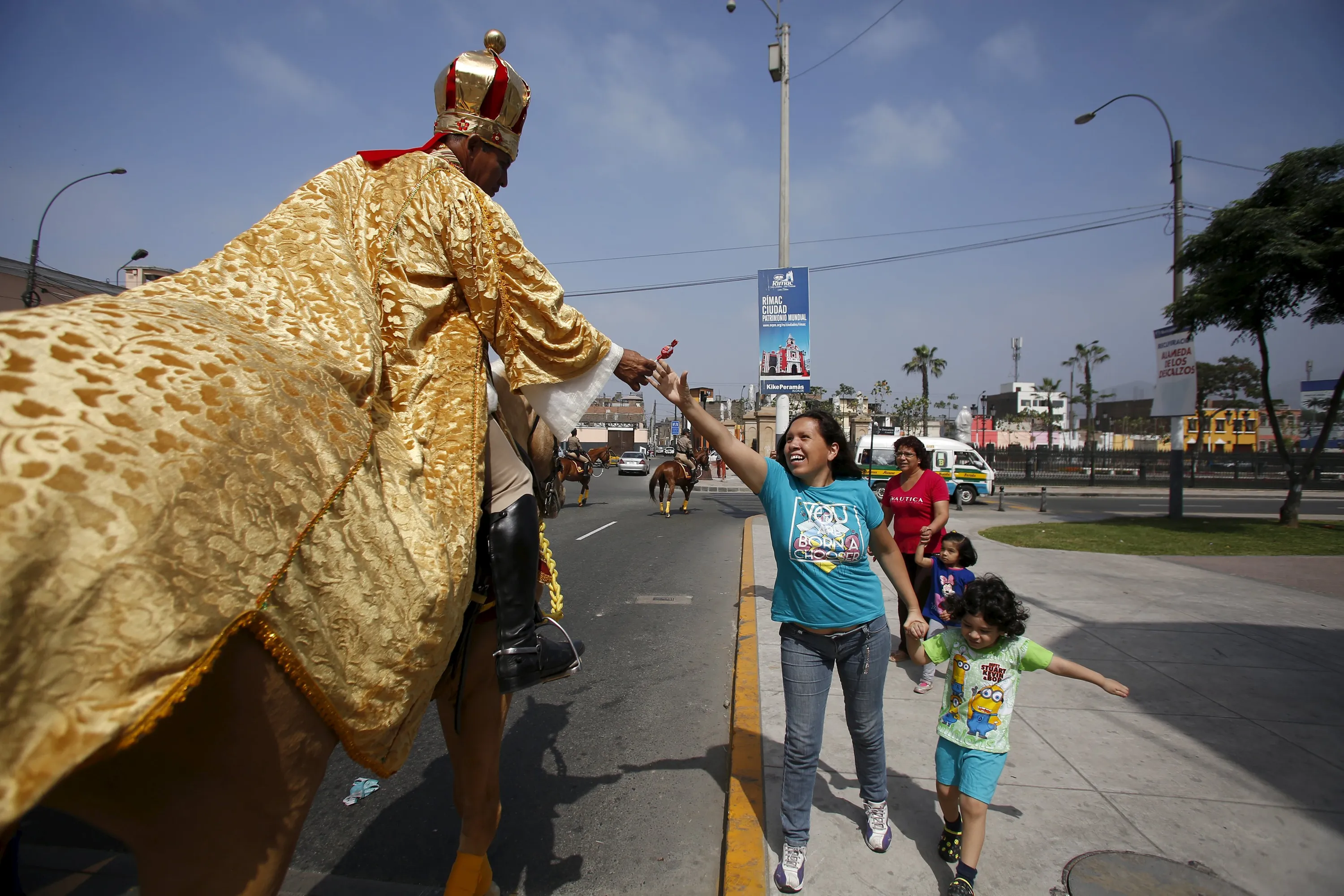 Children receive candy from a policeman dressed as one of the Three Wise Men during the celebration of Epiphany, or Three Kings' Day, in central Lima January 6, 2016. (Photo by Janine Costa/Reuters)