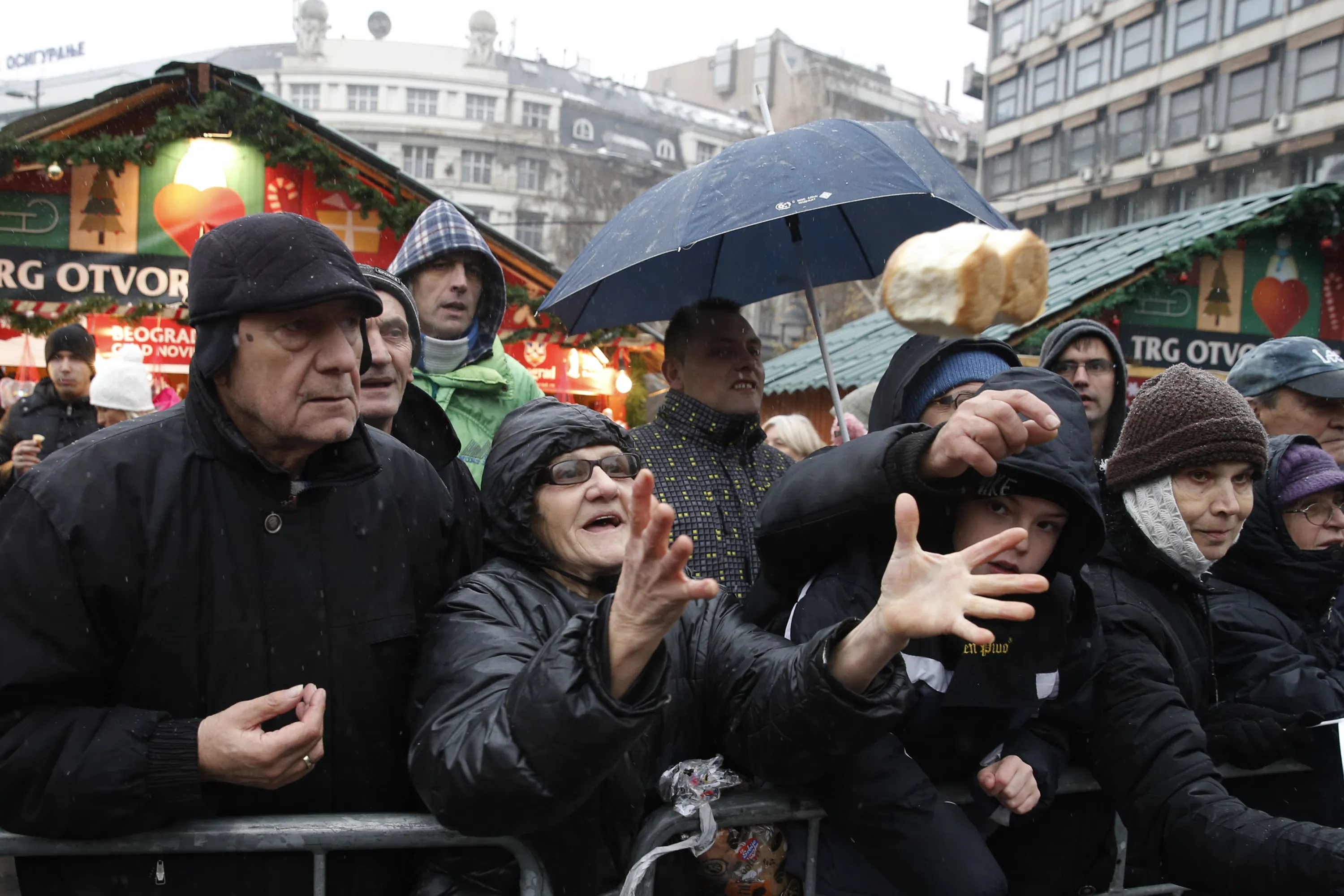 People gather to receive a piece of traditional Christmas bread, marking the Orthodox Christmas Day festivities in Belgrade, Serbia January 7, 2016. Serbian Orthodox believers celebrate Christmas on January 7, according to the Julian calendar. (Photo by Marko Djurica/Reuters)